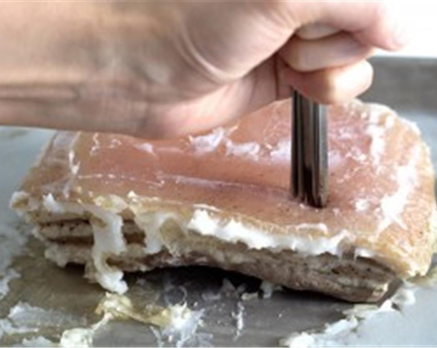 Nimm eine grosse Handvoll Holz- oder Metallspieße und steche gleichmässig und gründlich winzige Stiche durch die Haut in die oberste Fettschicht. Nicht wahllos einstechen, sondern systematisch von links nach rechts/von oben nach unten vorgehen.