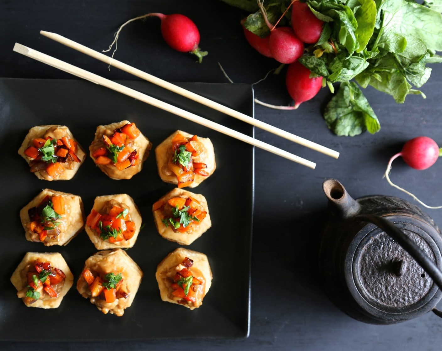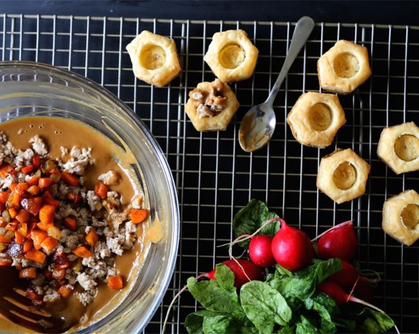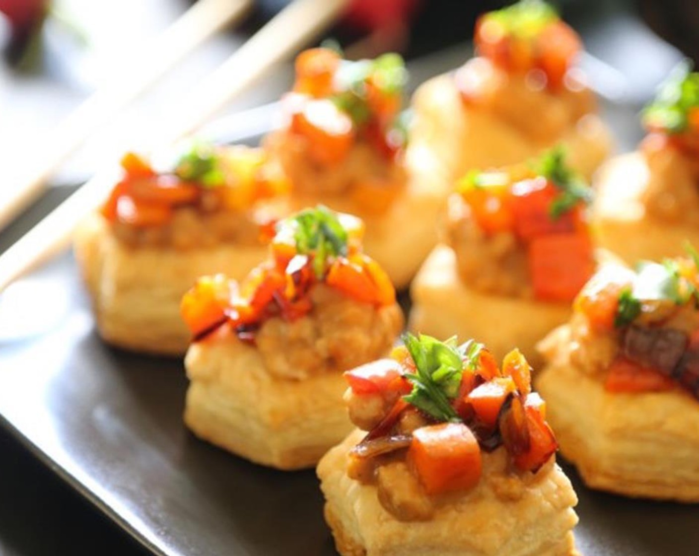 Diese kleinen Blätterteig-Pasteten sind mit würzigem asiatischem Poulet gefüllt, das mit einer Hoisin-Erdnusssauce geschwenkt wird. Diese Häppchen eignen sich als Apéro.