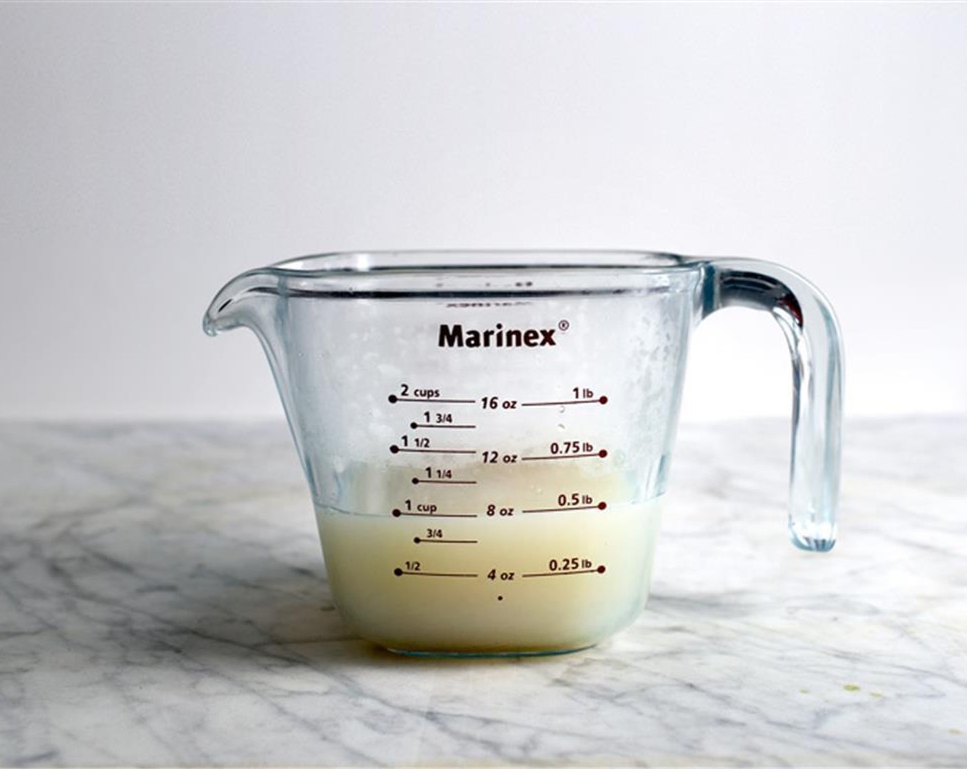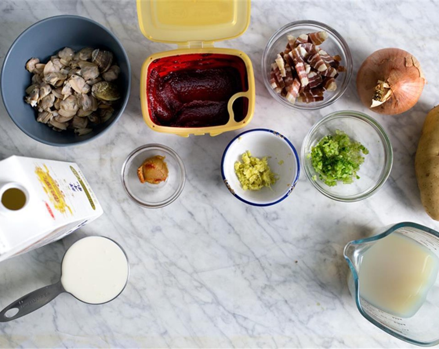 Das Muschelfleisch in den Kühlschrank stellen. Den Muschelsaft (240 ml) durch ein feines Sieb passieren - es sollte etwas mehr als 1 Tasse Flüssigkeit übrig bleiben. Saft beiseitestellen.