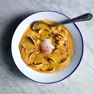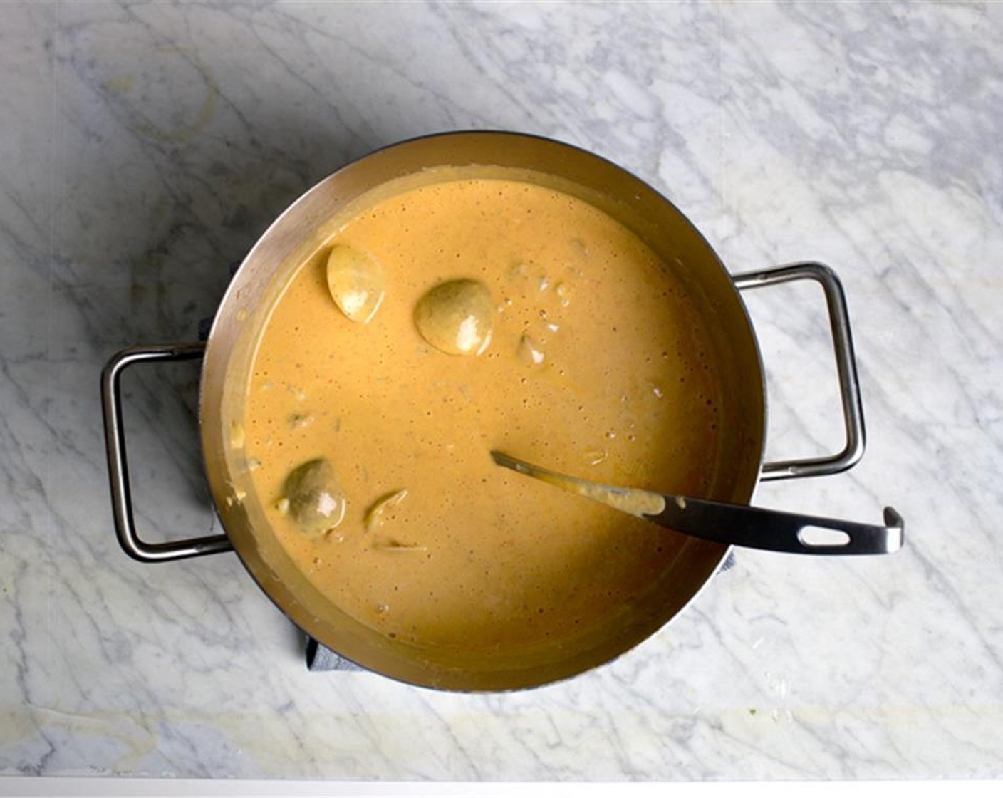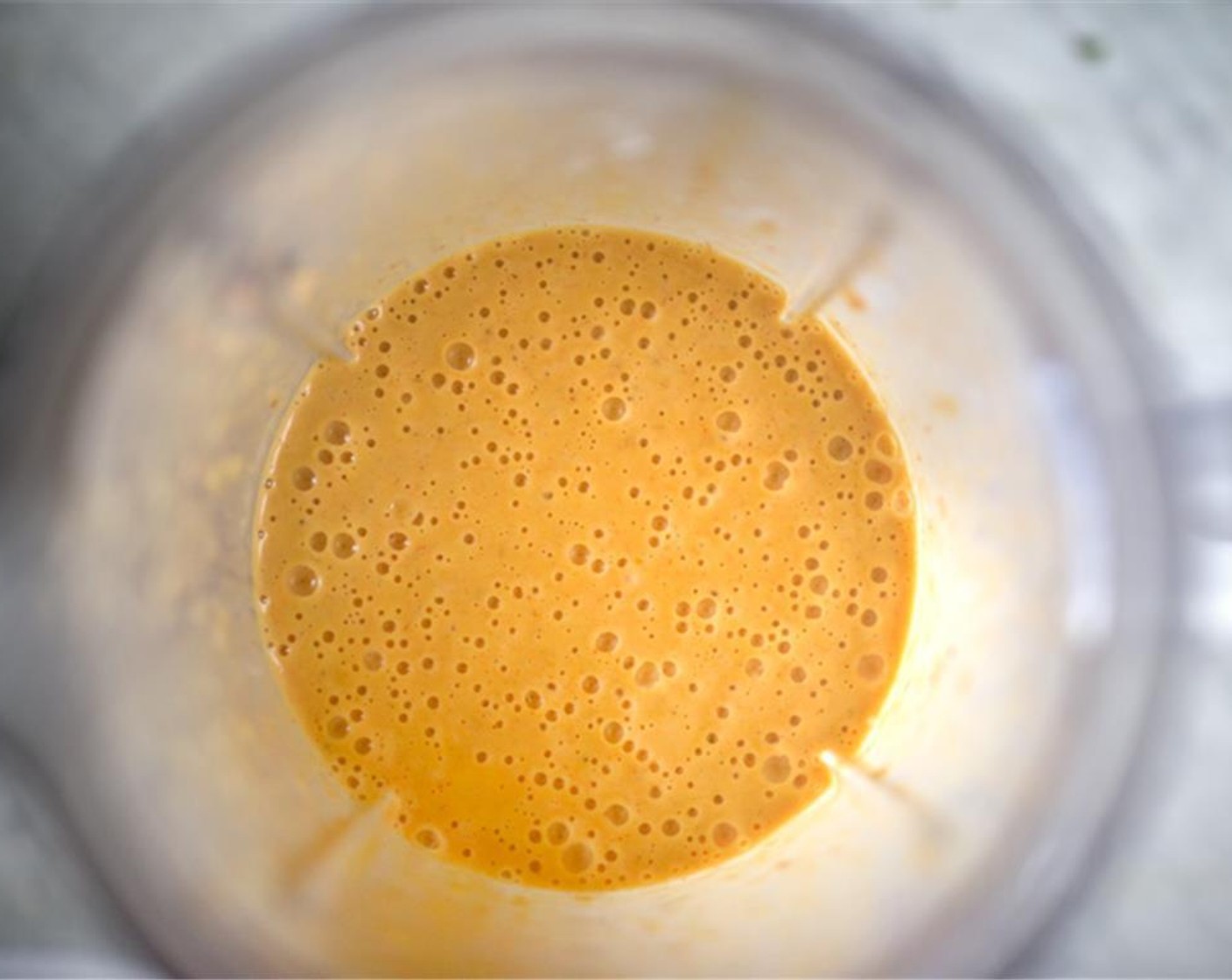 Nach dem Köcheln ist die Suppenmischung geronnen - Fett und Wasser haben sich getrennt und sehen körnig aus. Keine Panik! Die Suppe einfach in einen Mixer geben oder einen Stabmixer verwenden und pürieren, bis alles glatt und cremig ist.