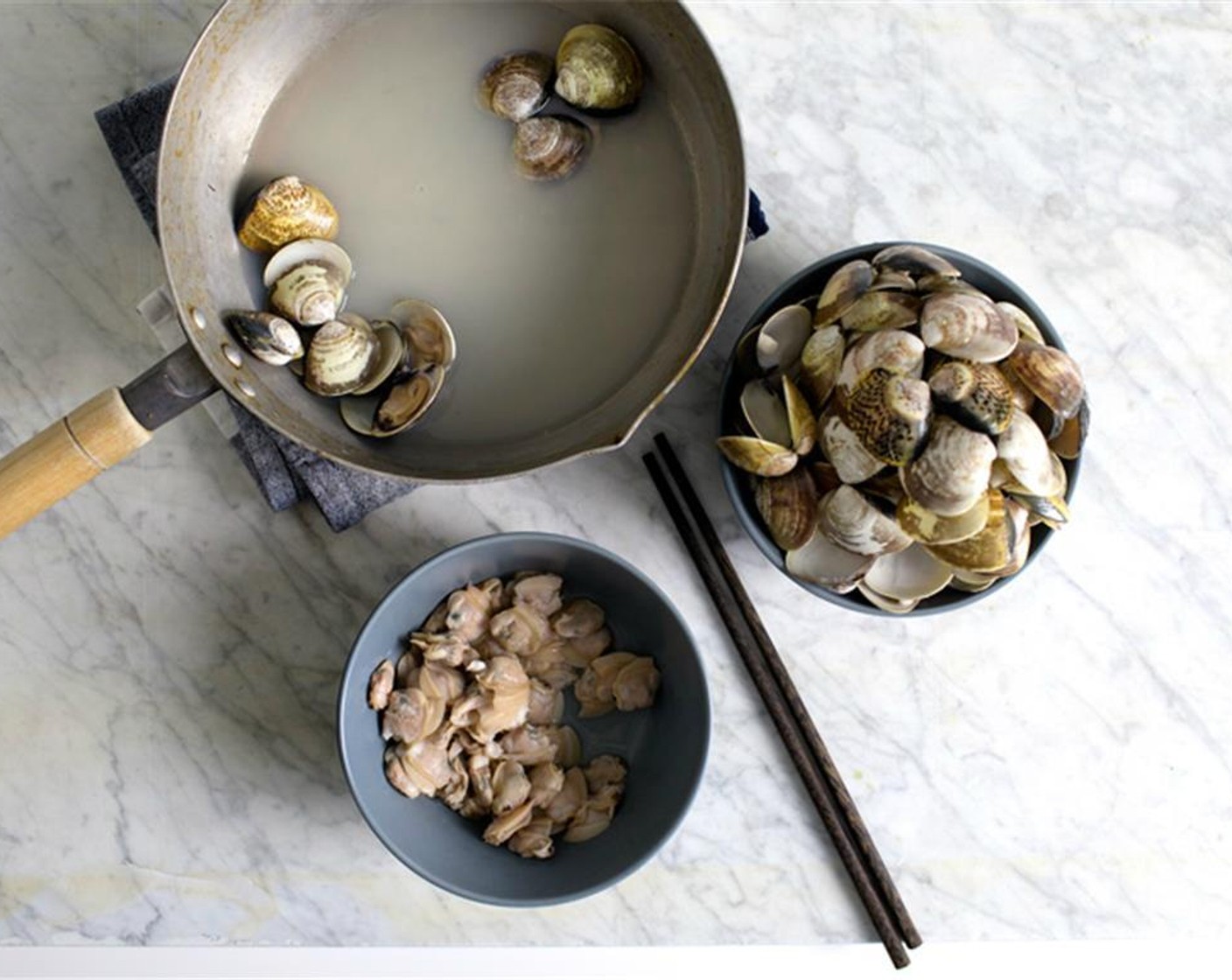 Die frischen Muscheln in einem Topf mit Sake (4 Esslöffel) bedecken, Deckel auflegen und bei mittlerer Hitze 2 bis 3 Minuten lang kochen, bis sie alle geöffnet sind. Das Fleisch herausnehmen und die Schalen wegwerfen. Das sollte etwa eine Tasse Fleisch geben.