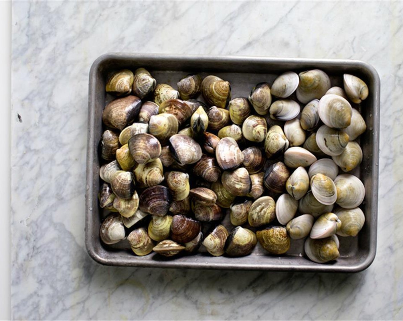 Die Muscheln (1.4 kg) für das Muschelfleisch und den Muschelsaft sowie die Muscheln (25), die später in der Suppe verwendet werden, reinigen. Nach dem Waschen die 25 später verwendeten Muscheln kalt stellen.