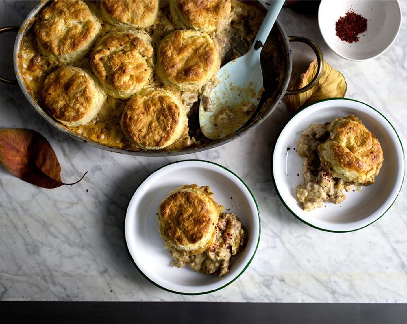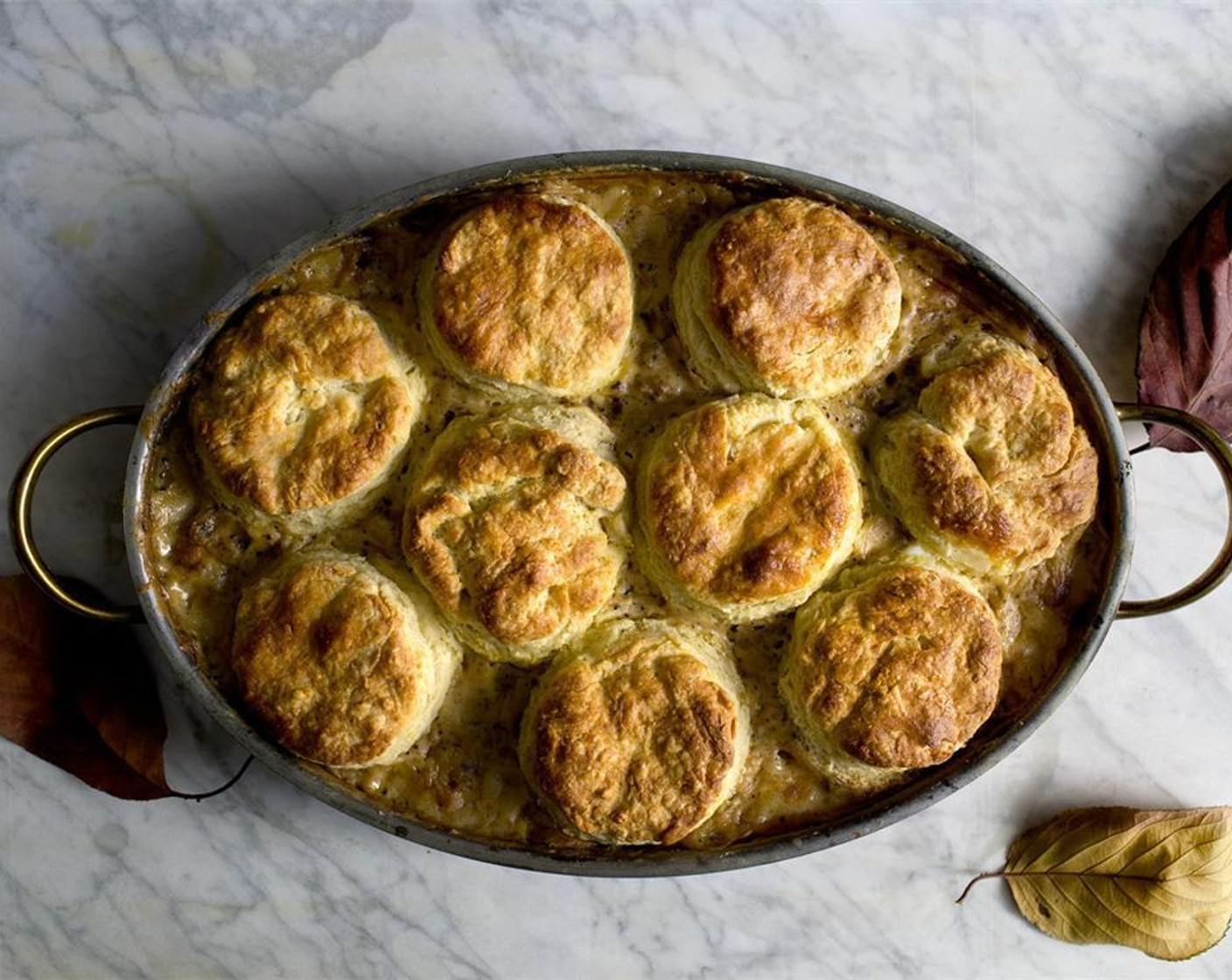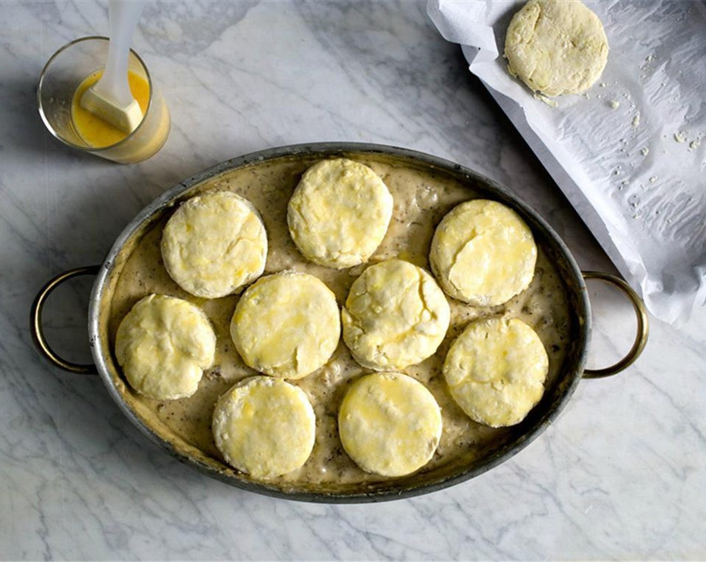 Die gefrorenen Scones auf die Sauce legen, mit Ei bestreichen und das Ganze in den vorheizeiten Ofen schieben und für 10 Minuten goldbraun backen.