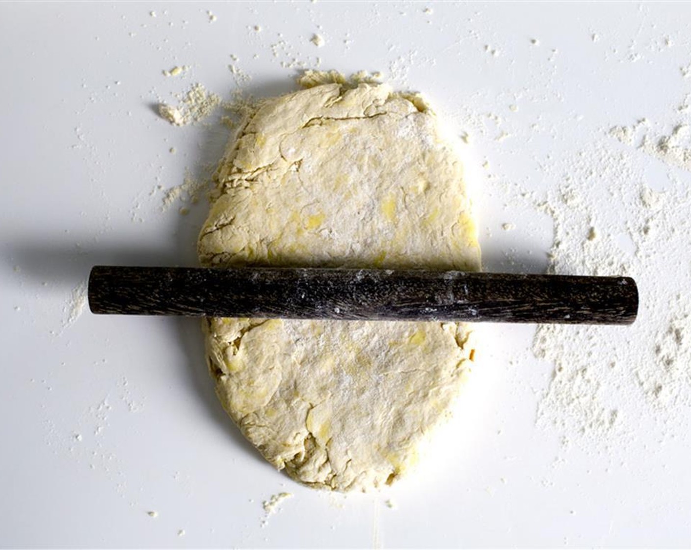Butter (120 g) mit einem Teigschneider hinzufügen, bis die grössten Stücke die Grösse von Erbsen haben. Die Mischung in eine grosse Schüssel geben und die Butter mit den Händen zu flachen Scheiben zerdrücken.