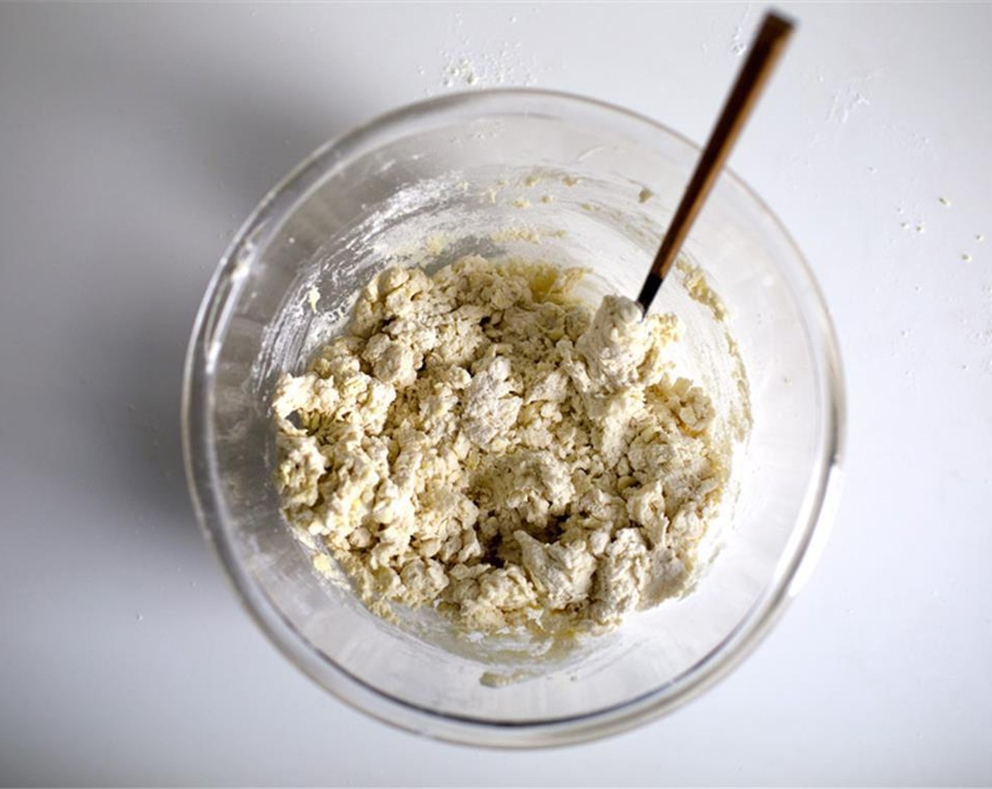 Buttermilch (240 ml) hinzugeben und die Mischung vorsichtig zusammenkneten, bis ein homogener Teig entsteht, der etwas trocken erscheint. Der Teig für die Buttermilch-Scones ist eher trocken und muss vor der Verwendung eingefroren werden.