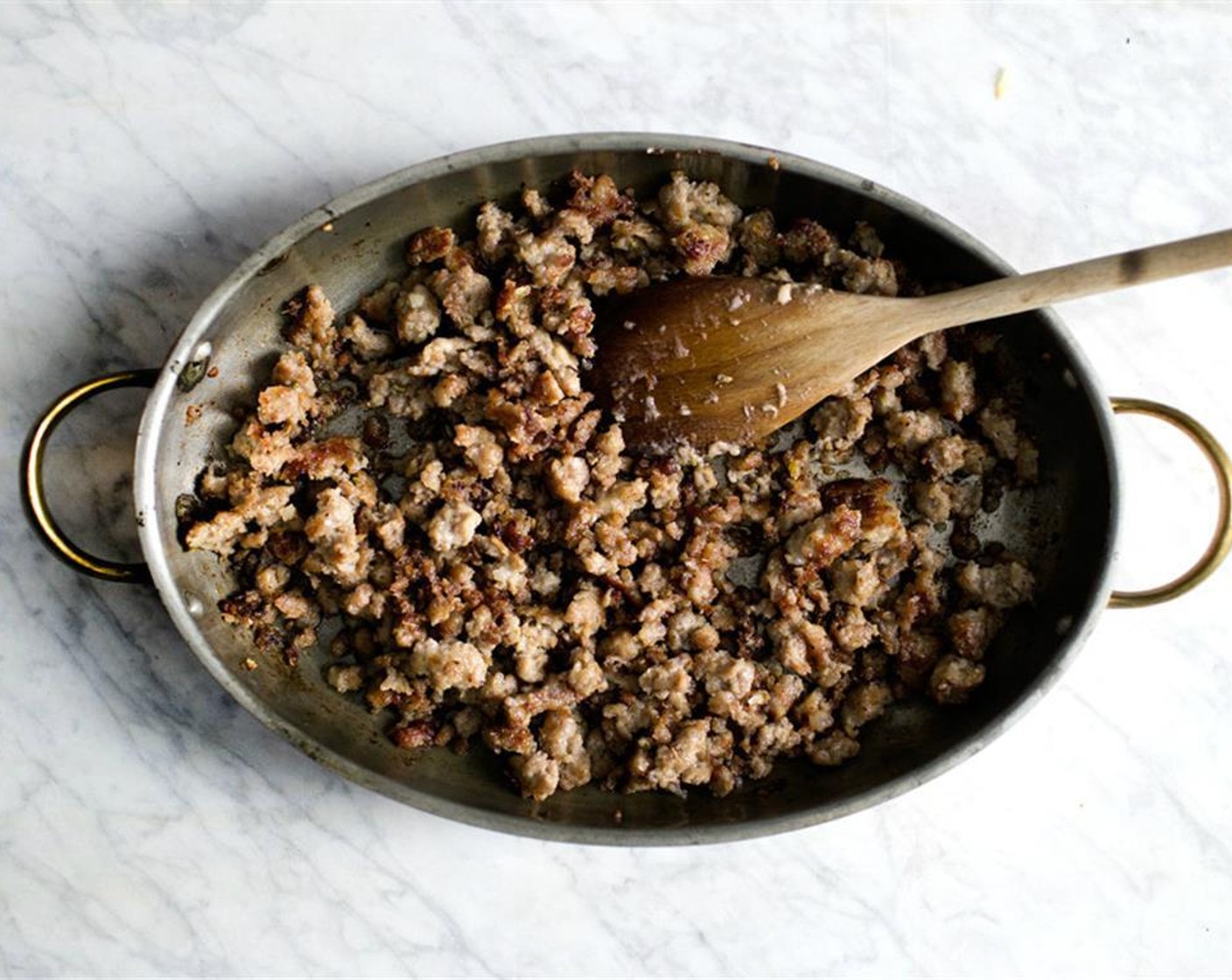 Eine grosse, ofenfeste Pfanne auf hoher Stufe erhitzen. Die Wurst in Pflanzenöl (nach Bedarf) anbraten und mit einem Holzlöffel in kleine Stücke brechen. Solange braten, bis das Fleish gar und gebräunt ist.