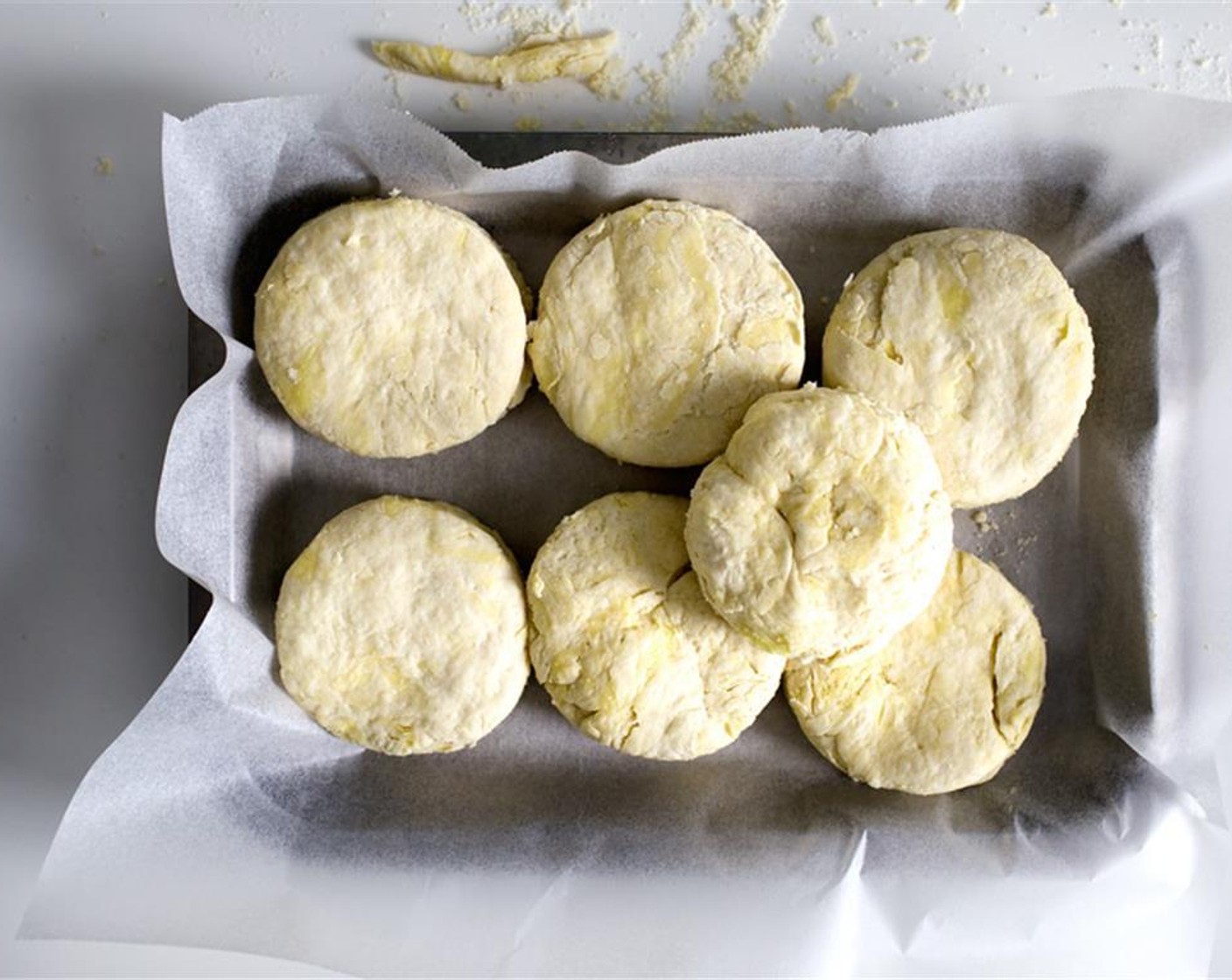 So viele Scones wie möglich mit einem Rundschneider aus dem Teig herausschneiden. Die Reste erneute ausrollen und ausstehen. Man erhält etwa 9 bis 10 Scones, diese auf einen mit Backpapier ausgelegten Teller legen und für 2 Stunden einfrieren, bis sie gefroren sind.