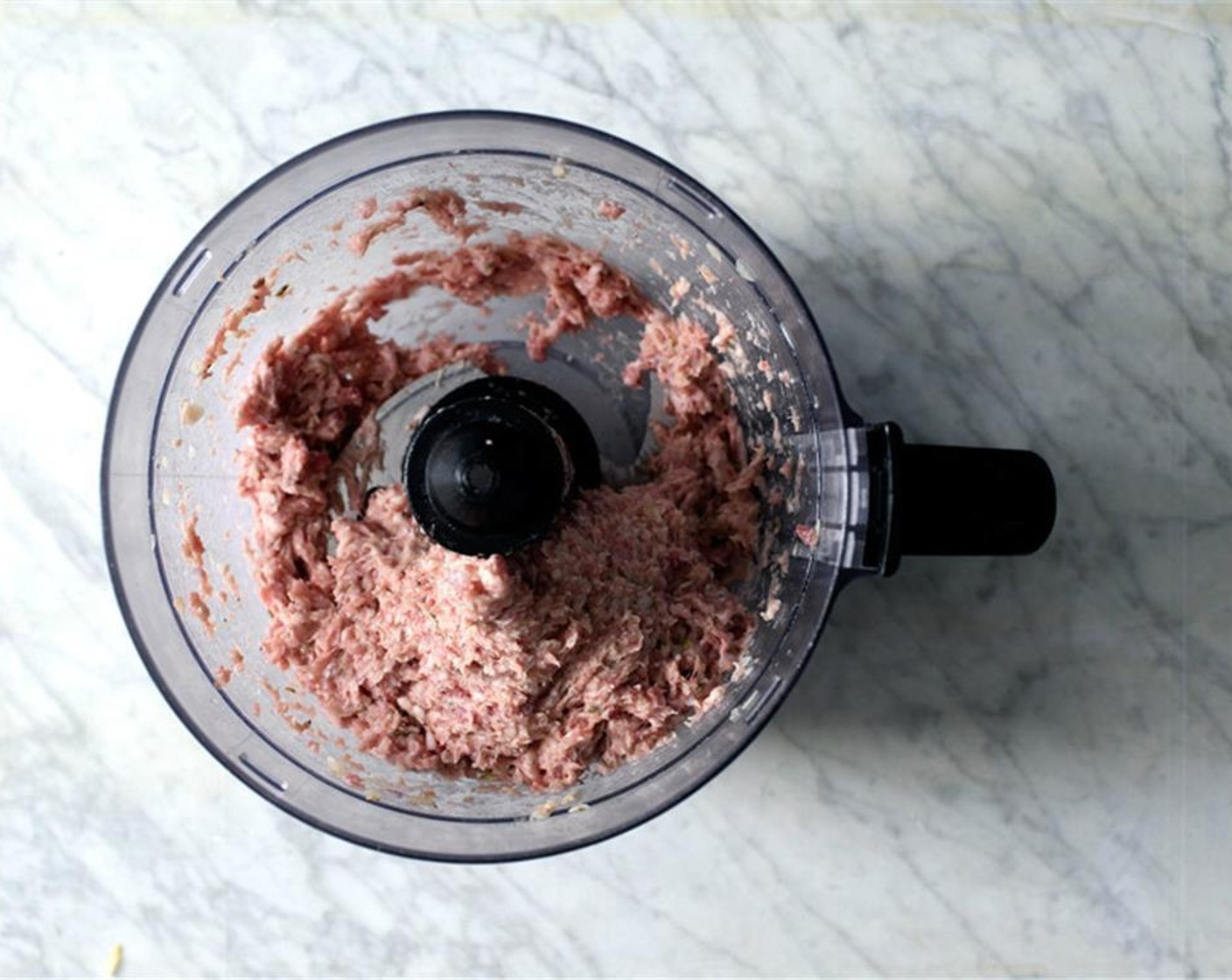 Für die Füllung, Schweinefleisch, Speisestärke (1 EL), Salz (2 Teelöffel), Ahornsirup (2 Teelöffel), Fenchelsamen (1 TL), schwarzen Pfeffer (1/2 TL) und weissen Pfeffer (1/4 TL) hinzufügen. Die Küchenmaschine laufen lassen, bis alles zu einer gleichmässigen Masse verarbeiten ist.