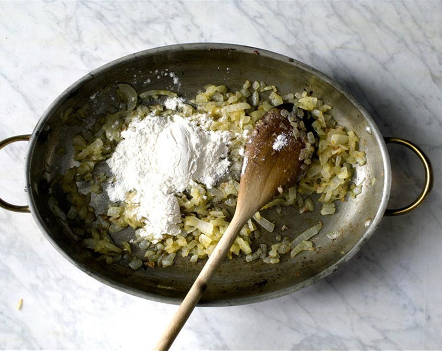 Zwiebel (1) hinzugeben und für 10 Minuten garen, bis sie gar und glasig ist. Mehl (3 Esslöffel) hinzufügen und ein paar Minuten köcheln lassen.