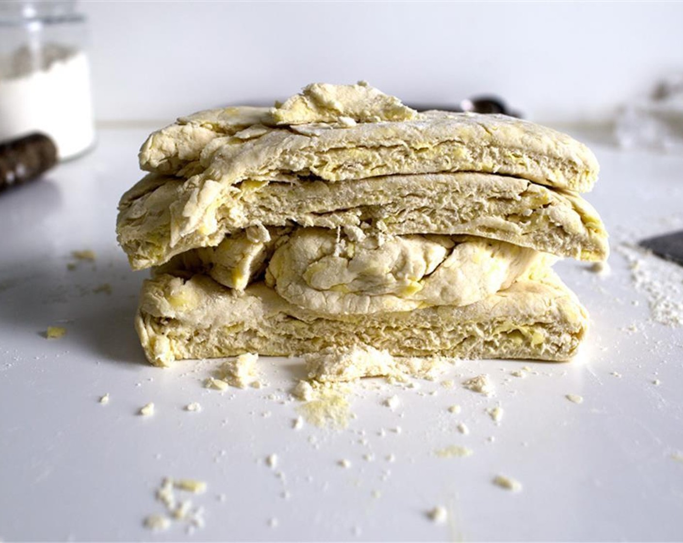 Den ausgerollten Teig vierteln, aufeinander stapeln (so entstehen die Schichten) und nochmals auf 2 cm dicke ausrollen.