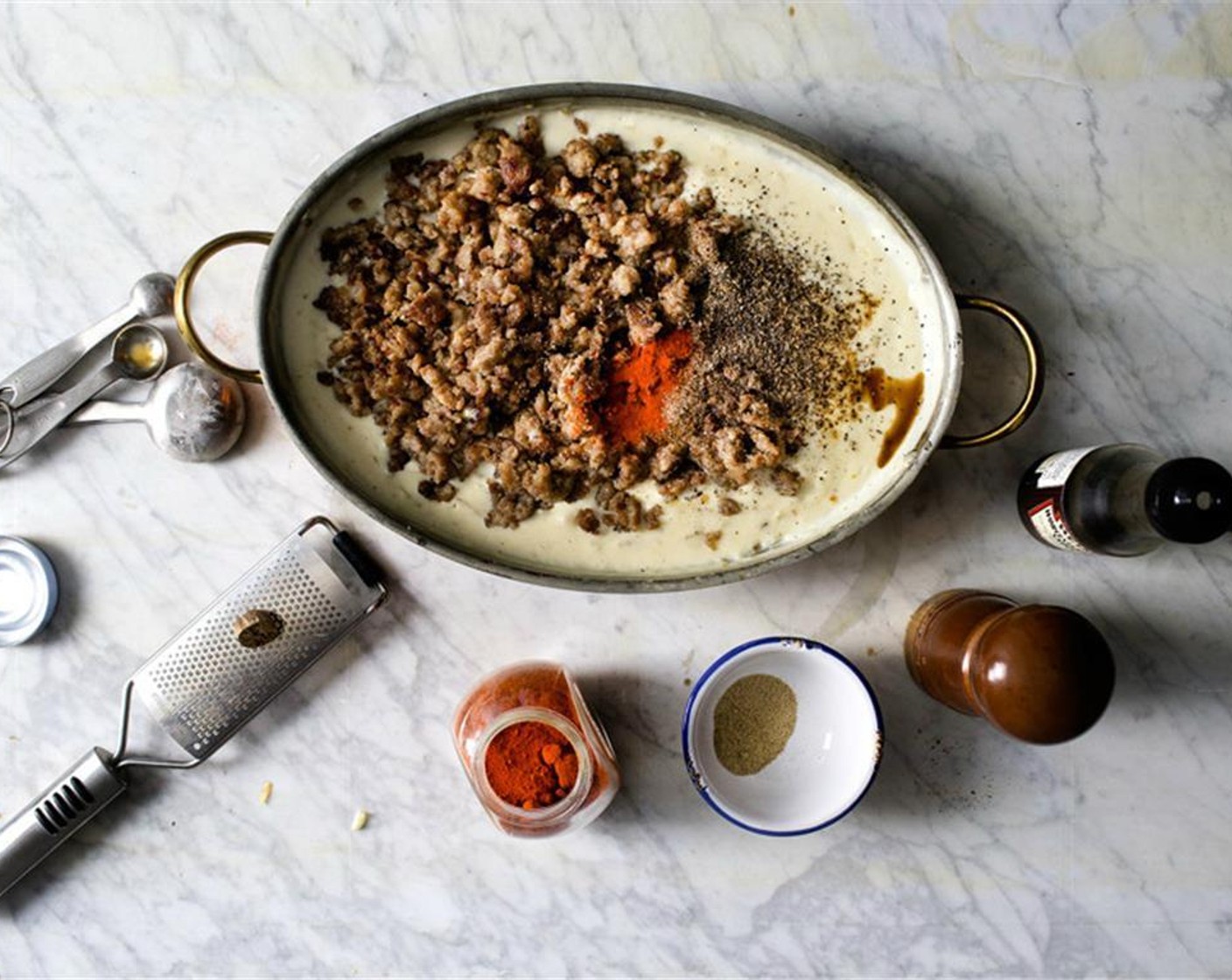 Mit Pfeffer (1 EL), Pfeffer (1 TL), Worcestershire Sauce (1/2 TL), Cayennepfeffer (1/2 TL) und Muskat (1/4 TL) würzen. 6 bis 8 Minuten köcheln lassen. Bei Bedarf mit Salz (wenig) nachwürzen.