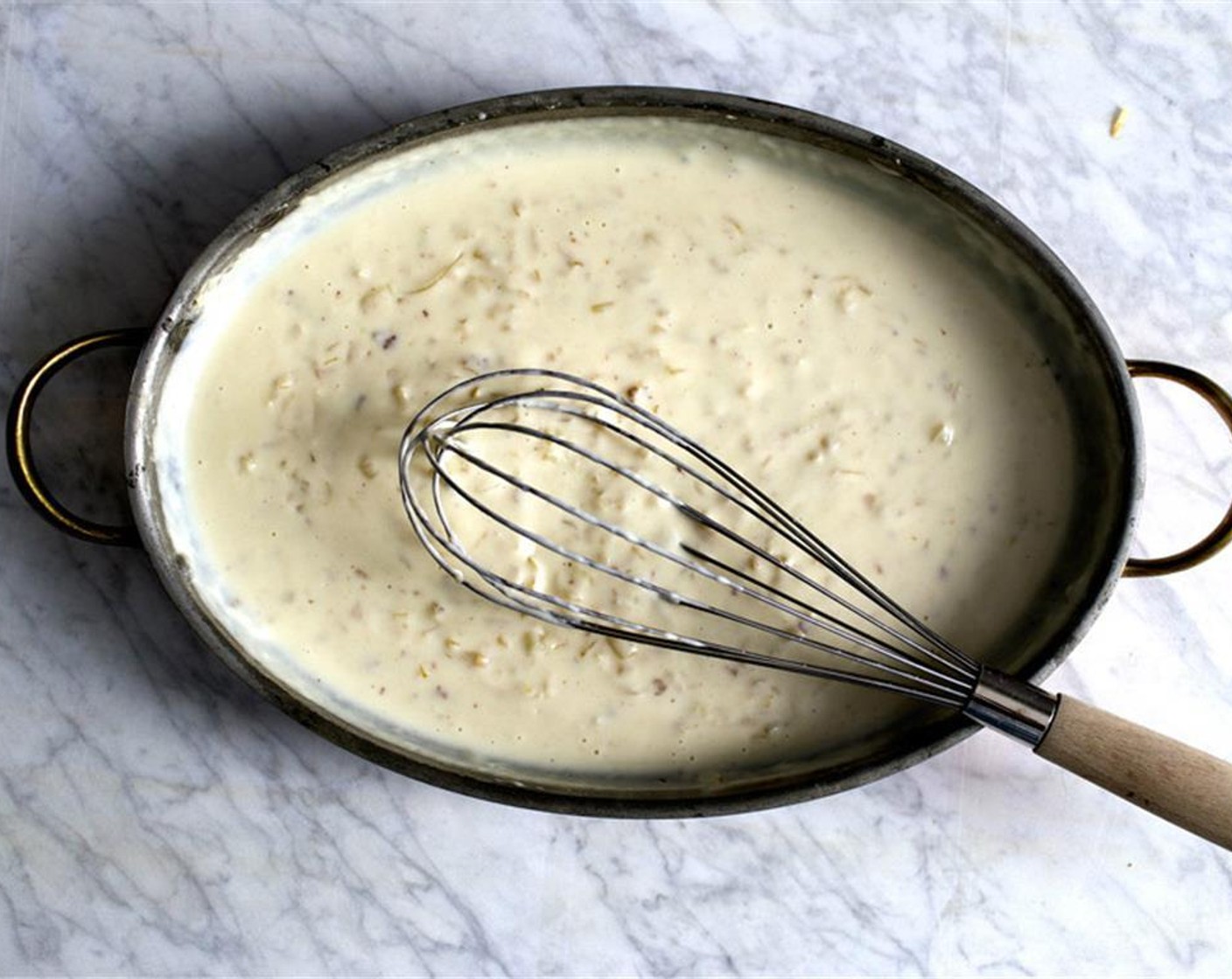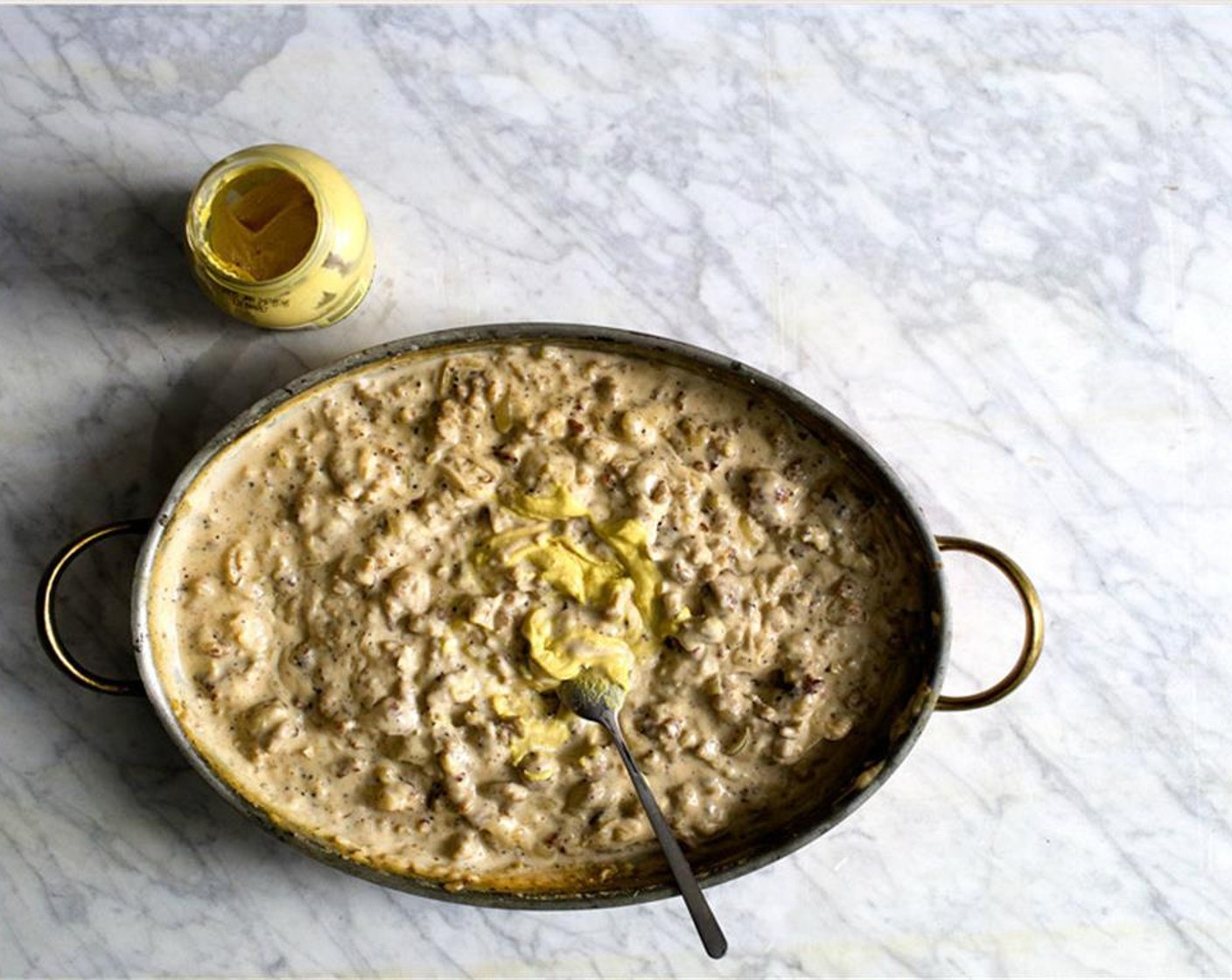 Den Ofen auf 250 °C vorheizen. Die Sauce bei Bedarf wieder zum Köcheln bringen, dann den Senf (1 1/2 Esslöffel) einrühren.