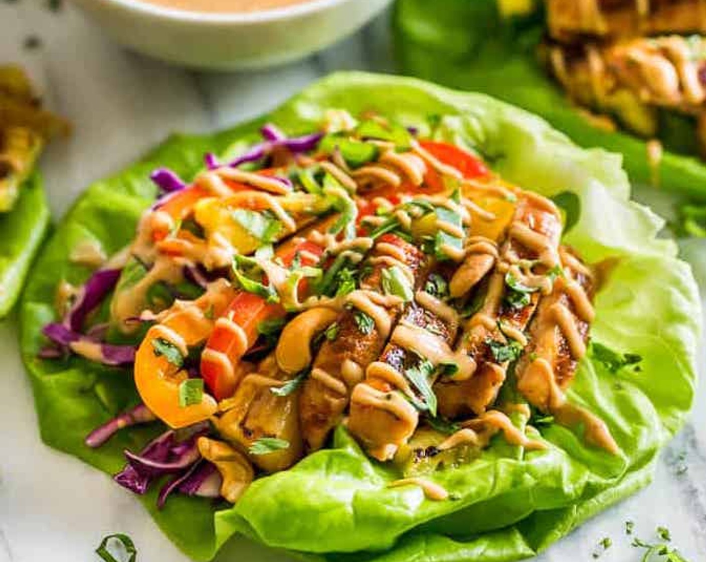 Thai-Style Poulet-Salatwraps mit Erdnuss-Sauce