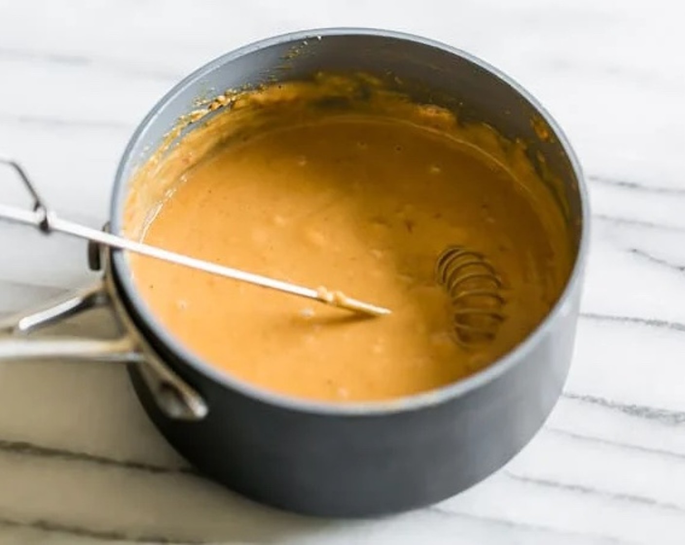 Die Erdnuss-Sauce kann auch luftdicht verschlossen bis zu einer Woche im Kühlschrank aufbewahrt werden.