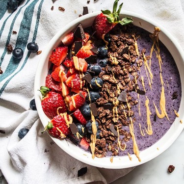 Diese vegane Blaubeer-Frühstücksbowl kombiniert Smoothie, Müsli, frisches Obst und Erdnussbutter in einer lebendigen Bowl voller Nährstoffe!