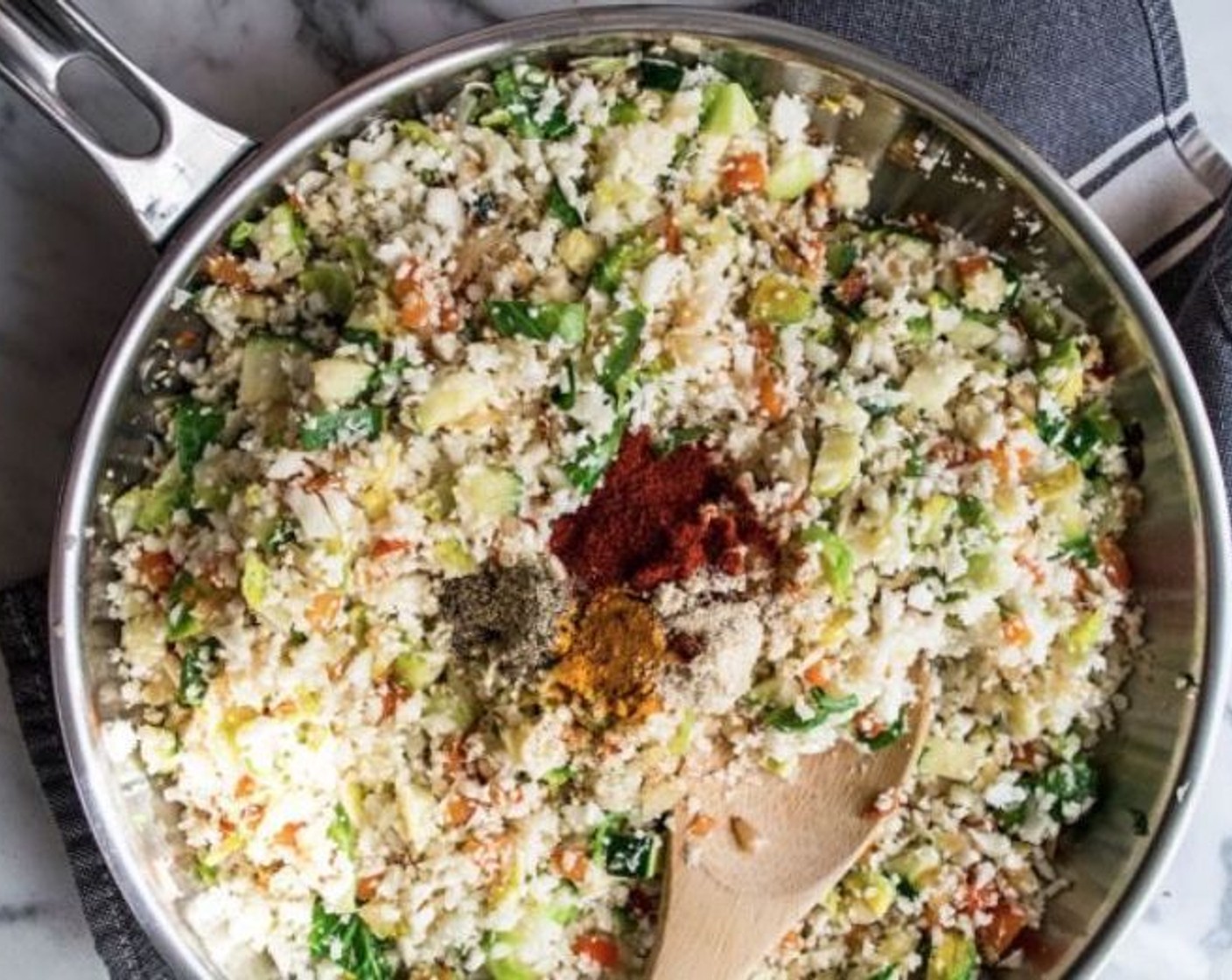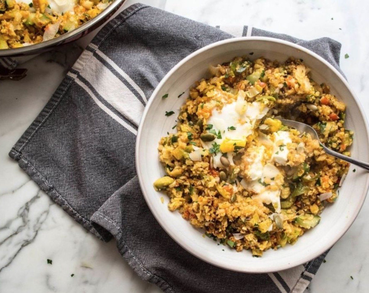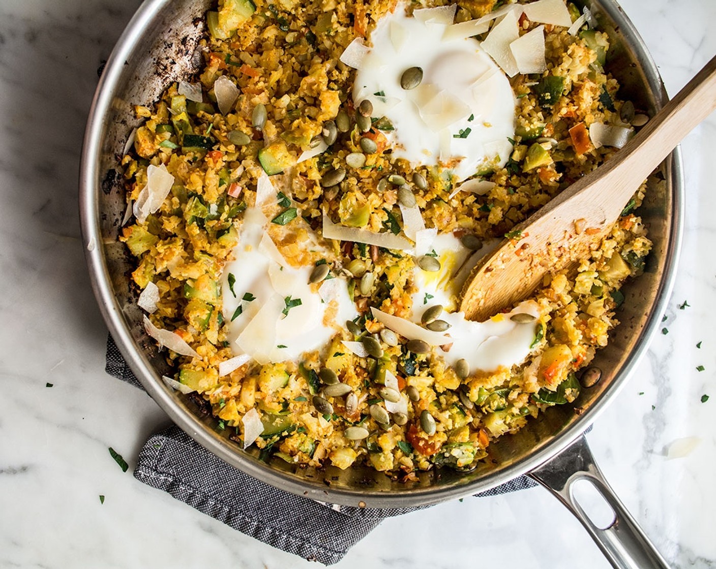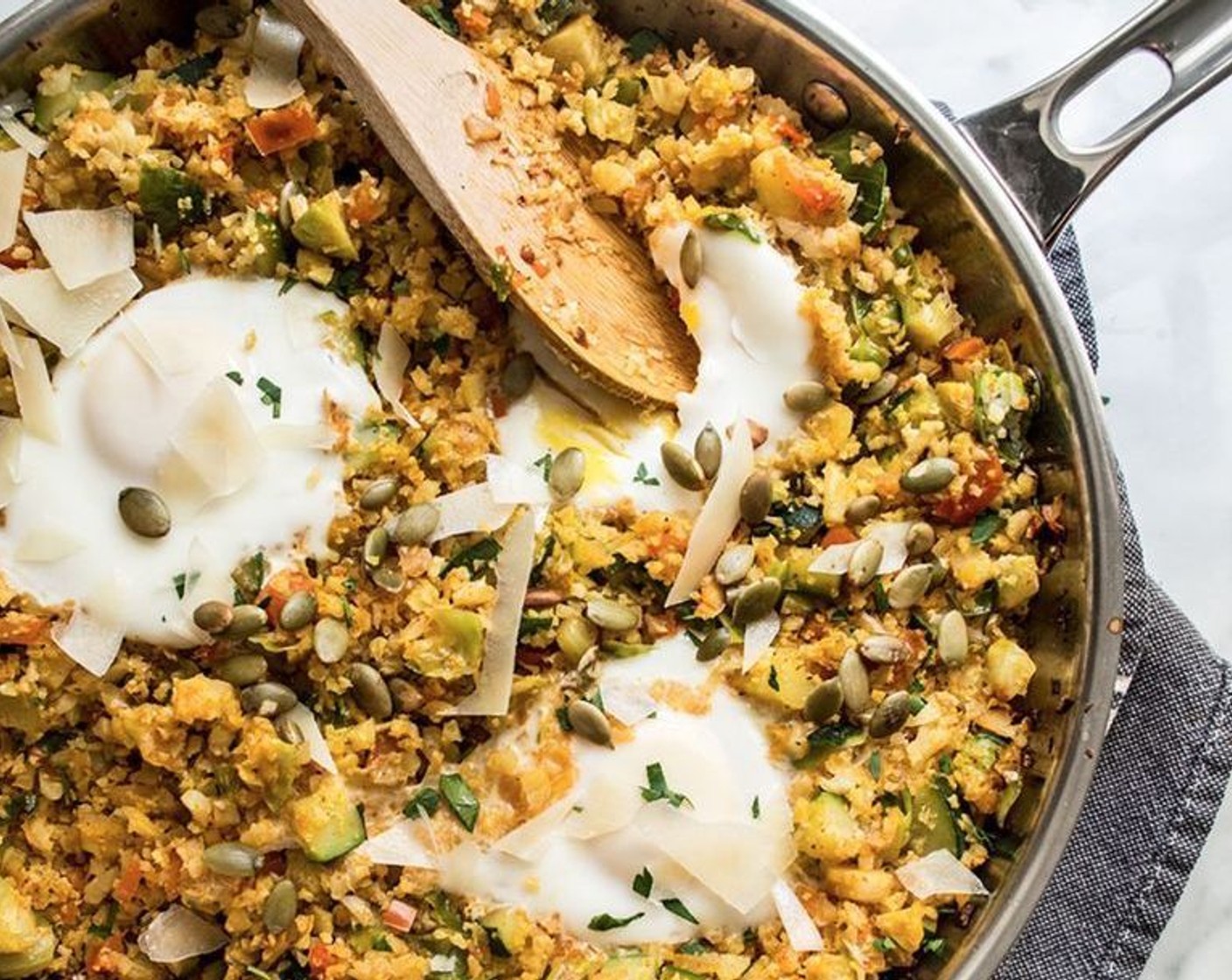 Hier kommen Geschmack, Textur, Knusprigkeit und Nährstoffe zusammen wie beste Freunde. Wir sprechen von Blumenkohl-Reis + Rosenkohl + Zucchini + Eiern + Parmesankäse + gerösteten Kürbiskernen. Jedes Element trägt dazu bei, dass diese Bowl zu einem wahren Geschmackserlebnis wird. Die Aromen harmonieren perfekt miteinander, während die verschiedenen Texturen für Abwechslung und Genuss sorgen.