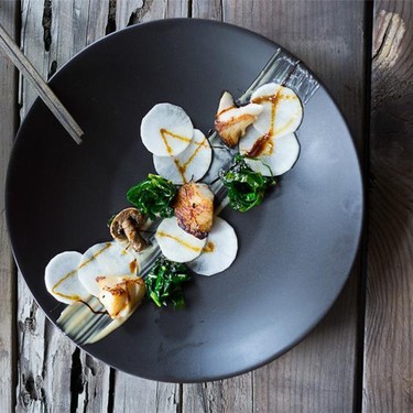 Schritt 12 Plattieren muss nicht einschüchternd sein. Einfach mit einem Übungsteller beginnen. Die Miso-Aioli quer über den Teller streichen, entweder in der Mitte oder an einer Seite. Den Rettich entlang dieser Linie platzieren.