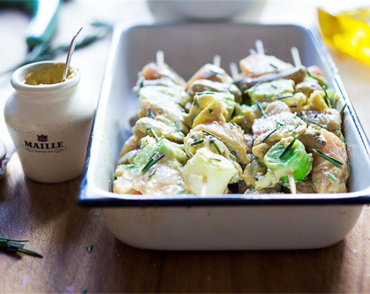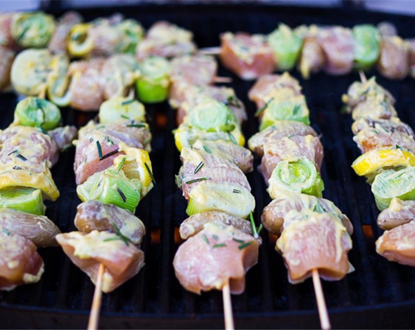 Verleihe den Poulet-Spiessen mit gegrilltem Lauch und Kartoffeln ein französisches Upgrade. Die zarten Spiesse werden in einer aromatischen Dijon-Knoblauch-Rosmarin-Sauce mariniert und gegrillt. Kombiniere das Gericht mit einem frischen Caesar-Salat für ein gesundes, leichtes und geschmackvolles Abendessen. Perfekt für eine stilvolle Mahlzeit mit einem Hauch von Frankreich!