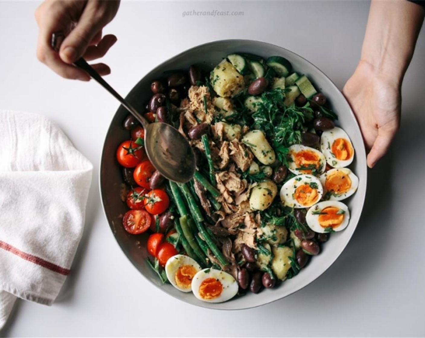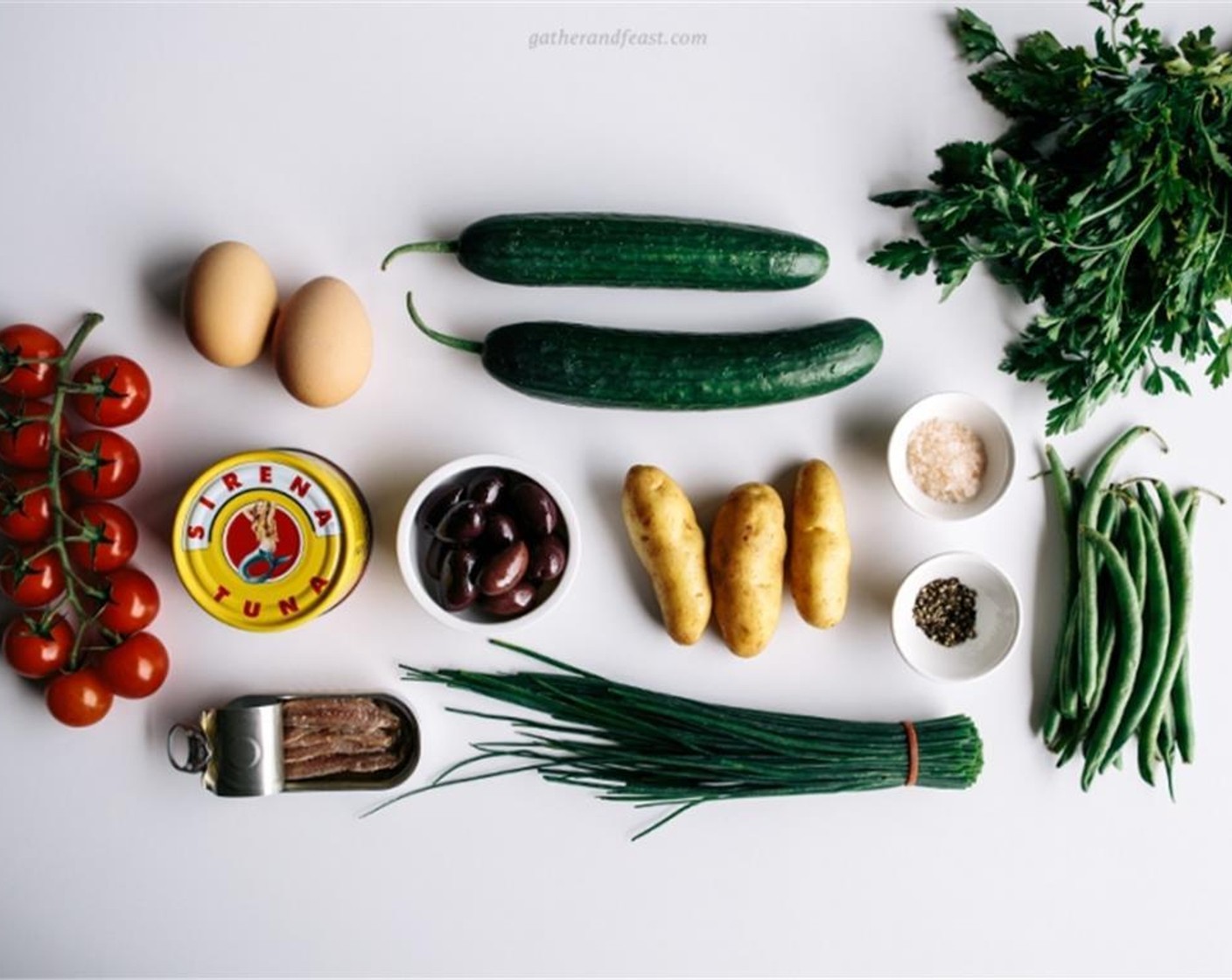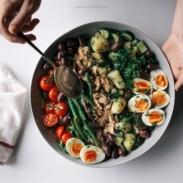 Dieses Rezept ist vollgepackt mit frischen Tomaten, Thunfisch, Ei, Oliven, Sardellen, Kartoffeln und grünen Bohnen. Ideal als Hauptmahlzeit, für das Picknick mit Freunden oder auf Partys.
