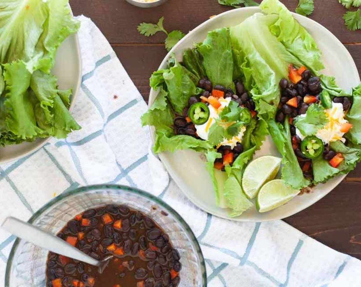 Gesunde und schnelle Salat Taco-Wraps mit schwarzen Bohnen aus der Mikrowelle. Diese leckeren Wraps kombinieren frische, knackige Salatblätter mit herzhaften schwarzen Bohnen, die in der Mikrowelle zubereitet werden. Perfekt für ein schnelles Mittag- oder Abendessen, bieten sie eine leichte, aber sättigende Mahlzeit. Ideal für alle, die auf der Suche nach einer gesunden, vegetarischen Option sind.