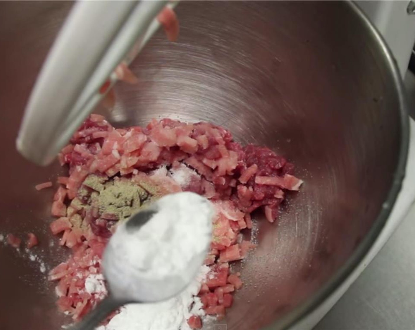 Fleisch, Salz (1 TL), Pfeffer (1/4 TL) und Speisestärke (1 EL) in eine grosse Rührschüssel einer Küchenmaschine geben.