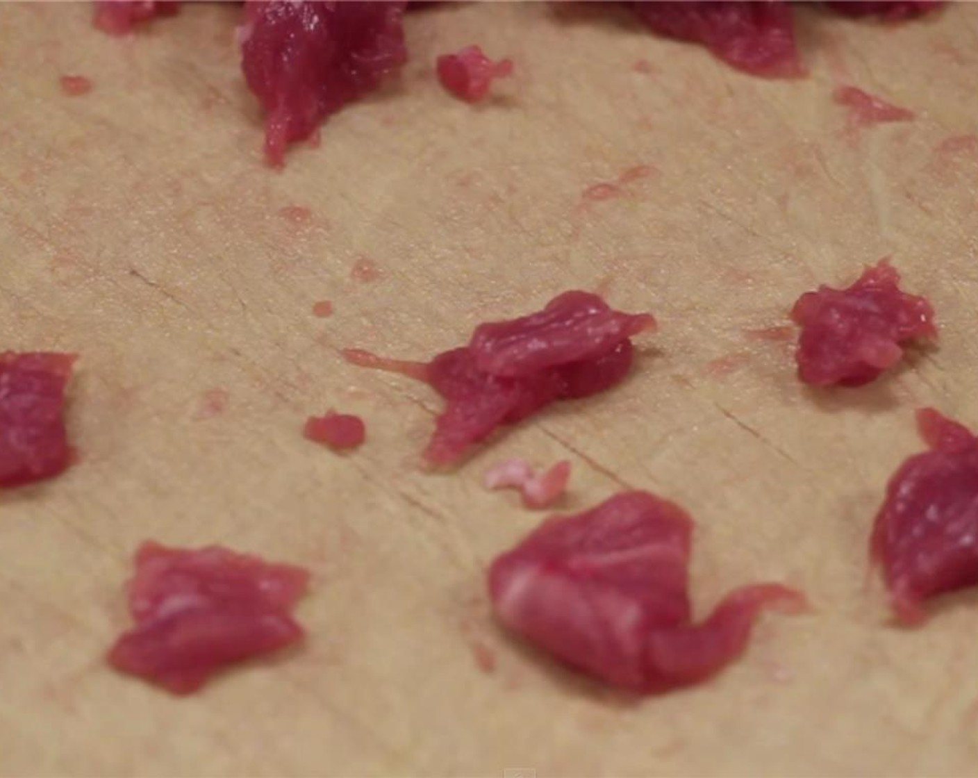 Fleisch (285 g) in etwa 3 cm Würfel oder kleiner schneiden.