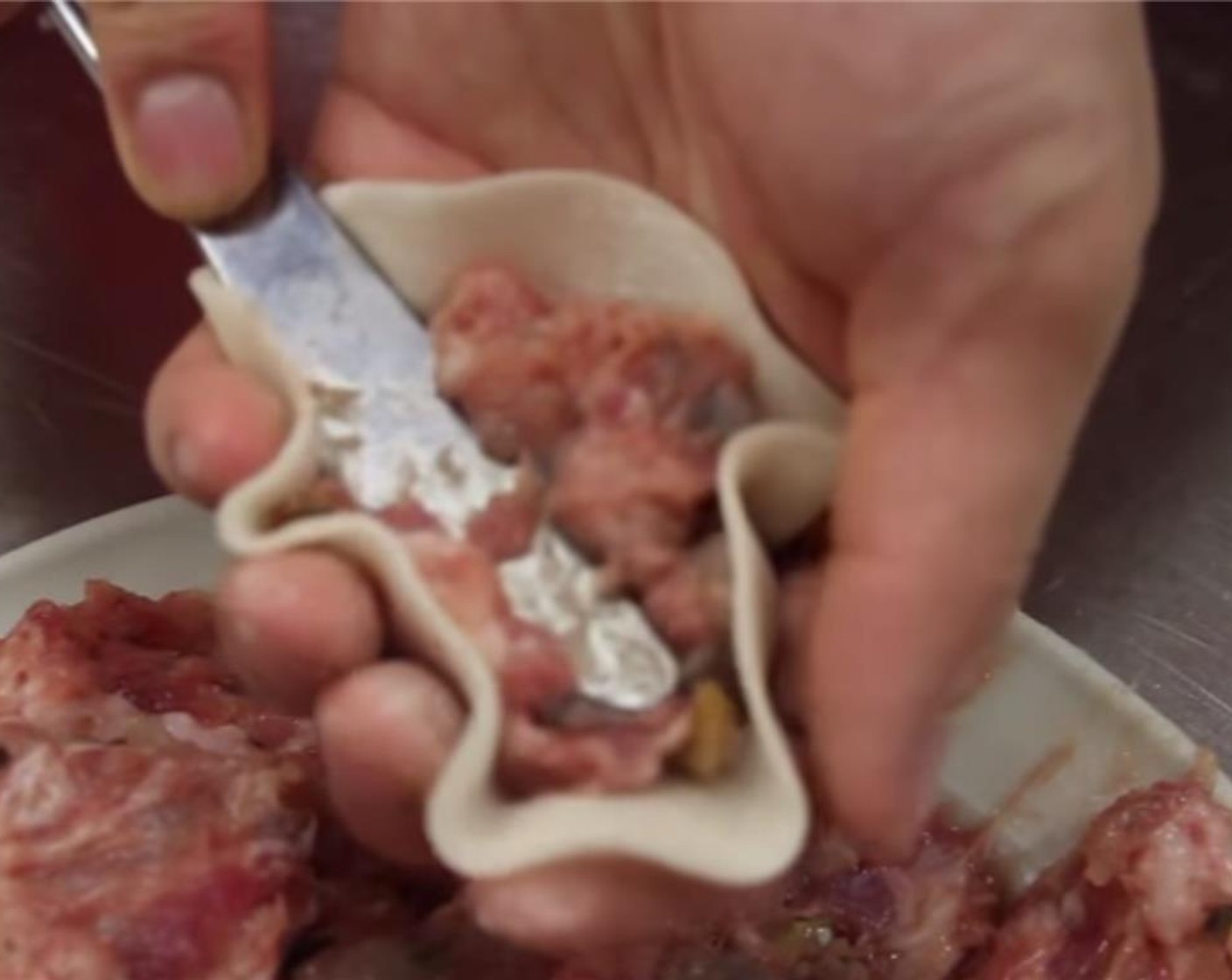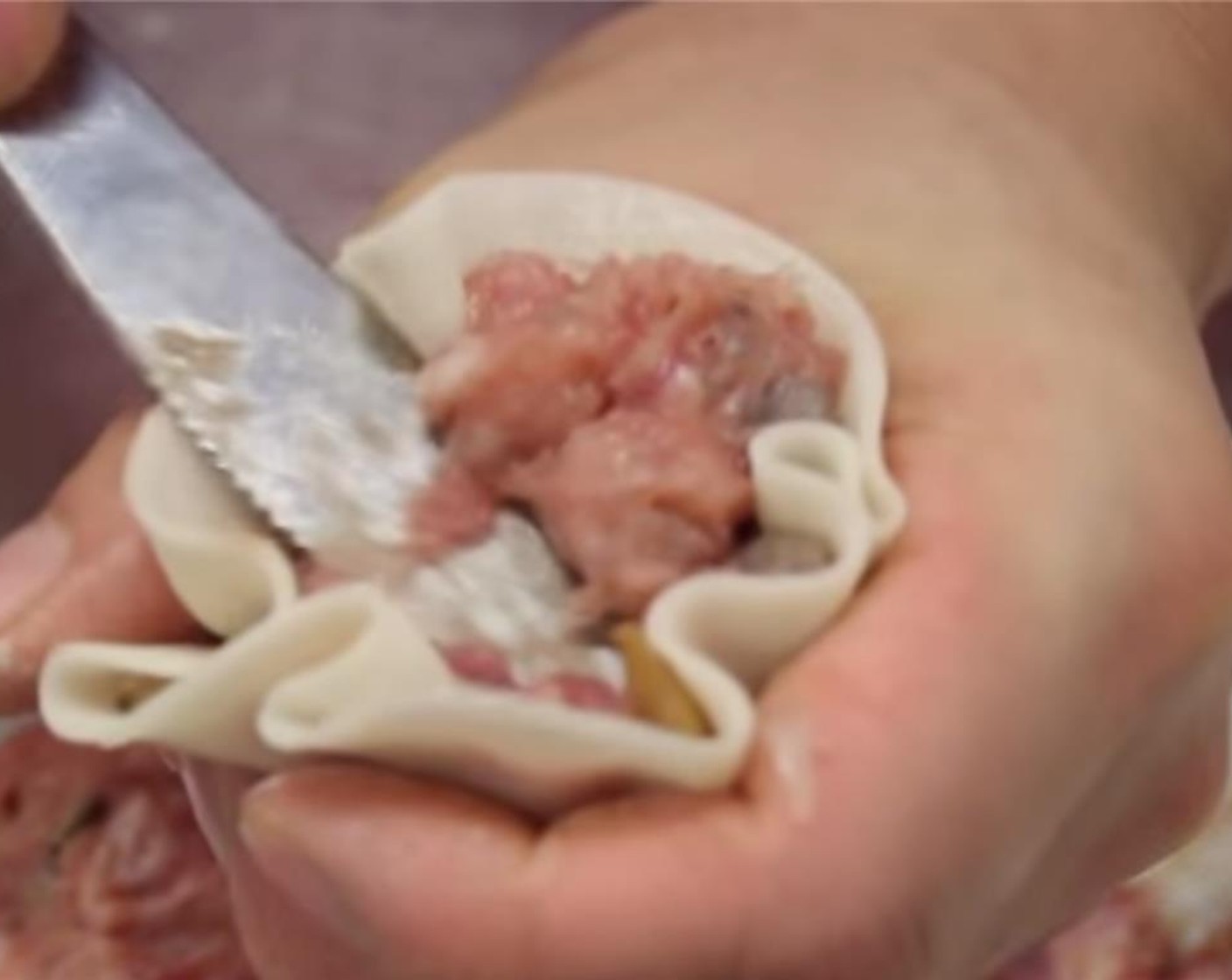 Wonton Teigblätter (20) mittig mit etwas von der Masse füllen. Die Seite eindrücken, sodass eine „C“-Schale entsteht. Die Füllung sollte am Messer haften bleiben.