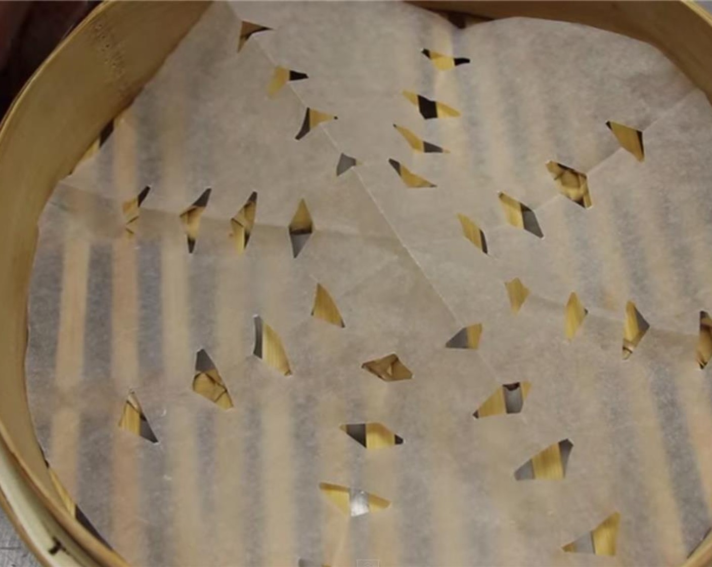 Zum Dämpfen in ein Backpapier kleinere Löcher schneiden. Dann das Bambuskörbchen mit diesem Papier auslegen, damit der Dampf besser eindringen kann.