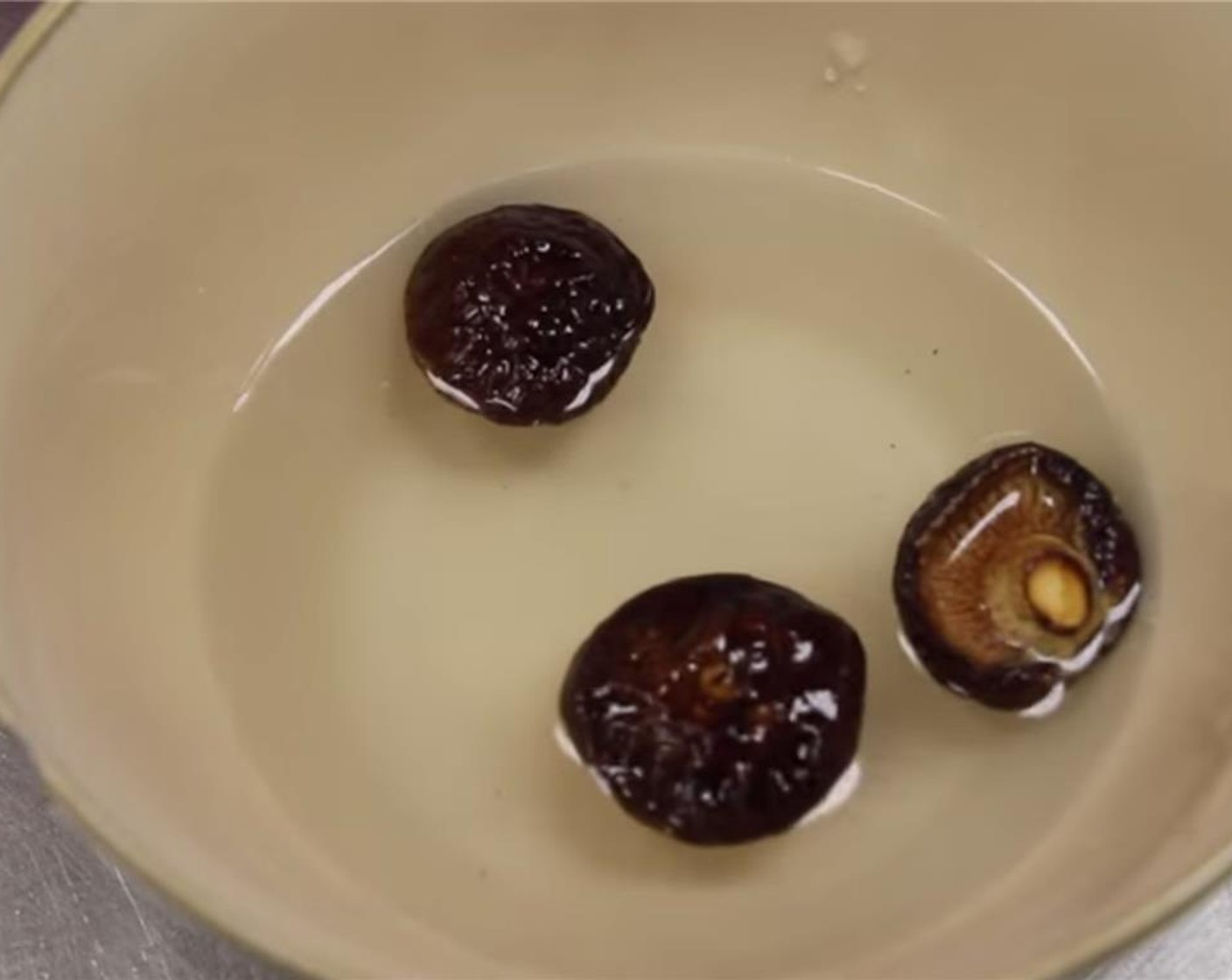 Shitake (3) 30 Minuten bis 1 Stunde in heissem Wasser einweichen.