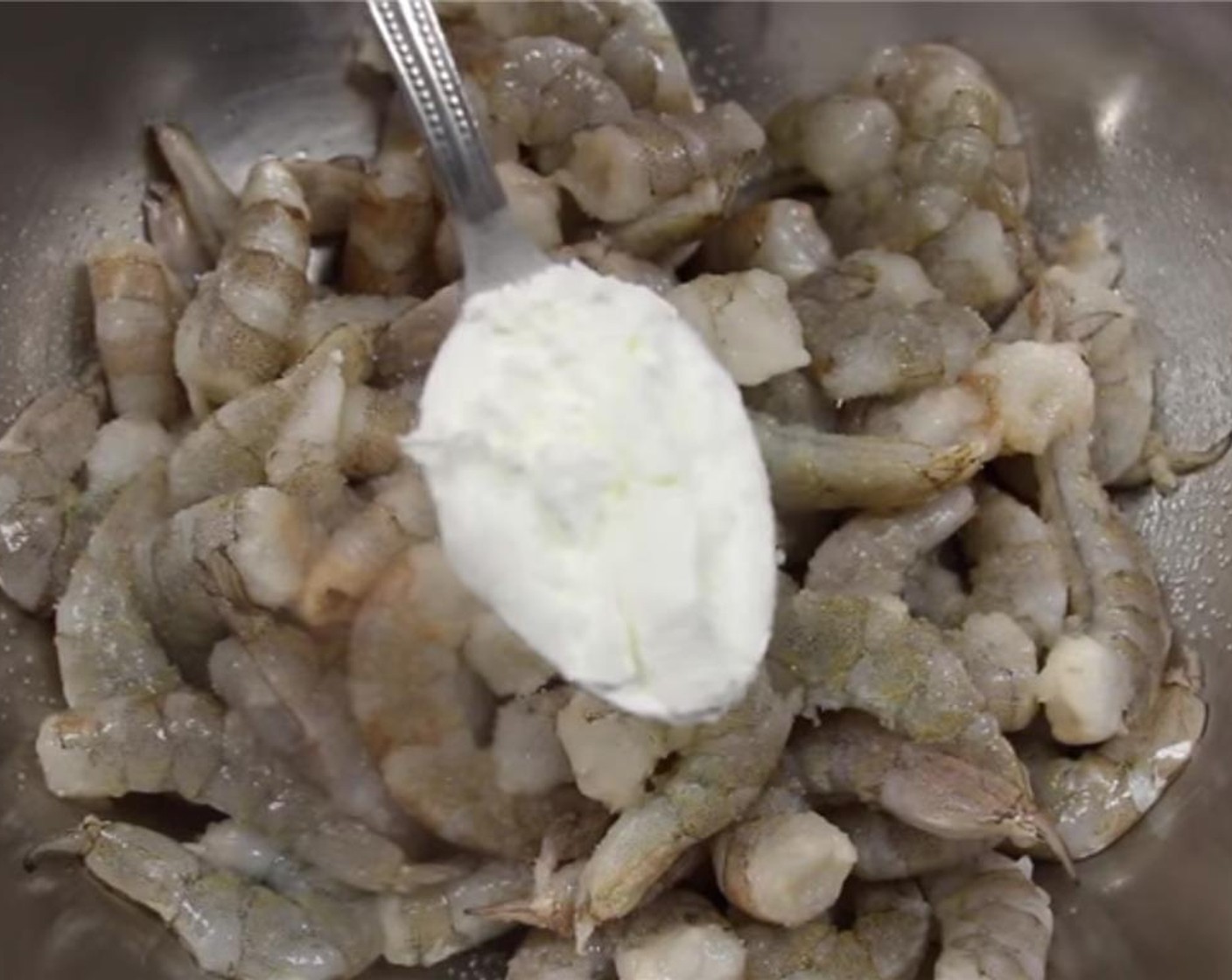 Dann in eine Schüssel geben. Salz (1/2 TL), Kartoffelstärke (2 Teelöffel) und Wasser (2 Teelöffel) hinzufügen und verrühren. 10 bis 15 Minuten ziehen lassen.
