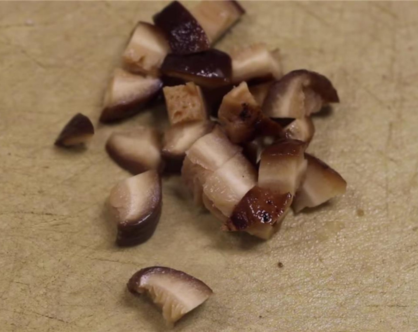 Überschüssige Flüssigkeit aus den Shitake-Pilzen auspressen und in feine Stücke schneiden.