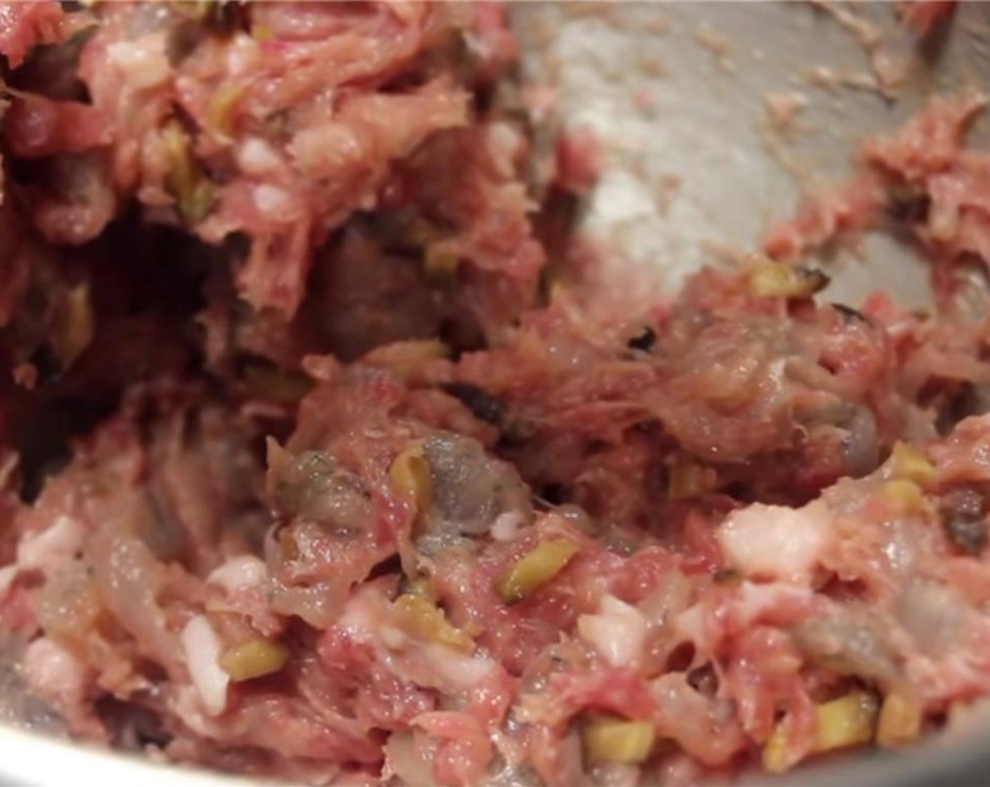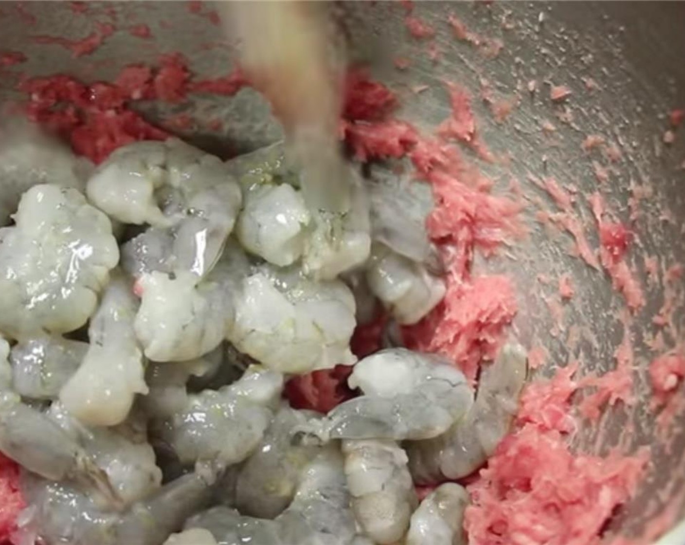 Shrimps hinzugeben. Wieder mit niedriger Geschwindigkeit beginnen und allmählich auf mittlere Geschwindigkeit erhöhen. Schlagen, bis die Shrimps vollständig in das Fleisch eingearbeitet sind und die Mischung klebrig ist.