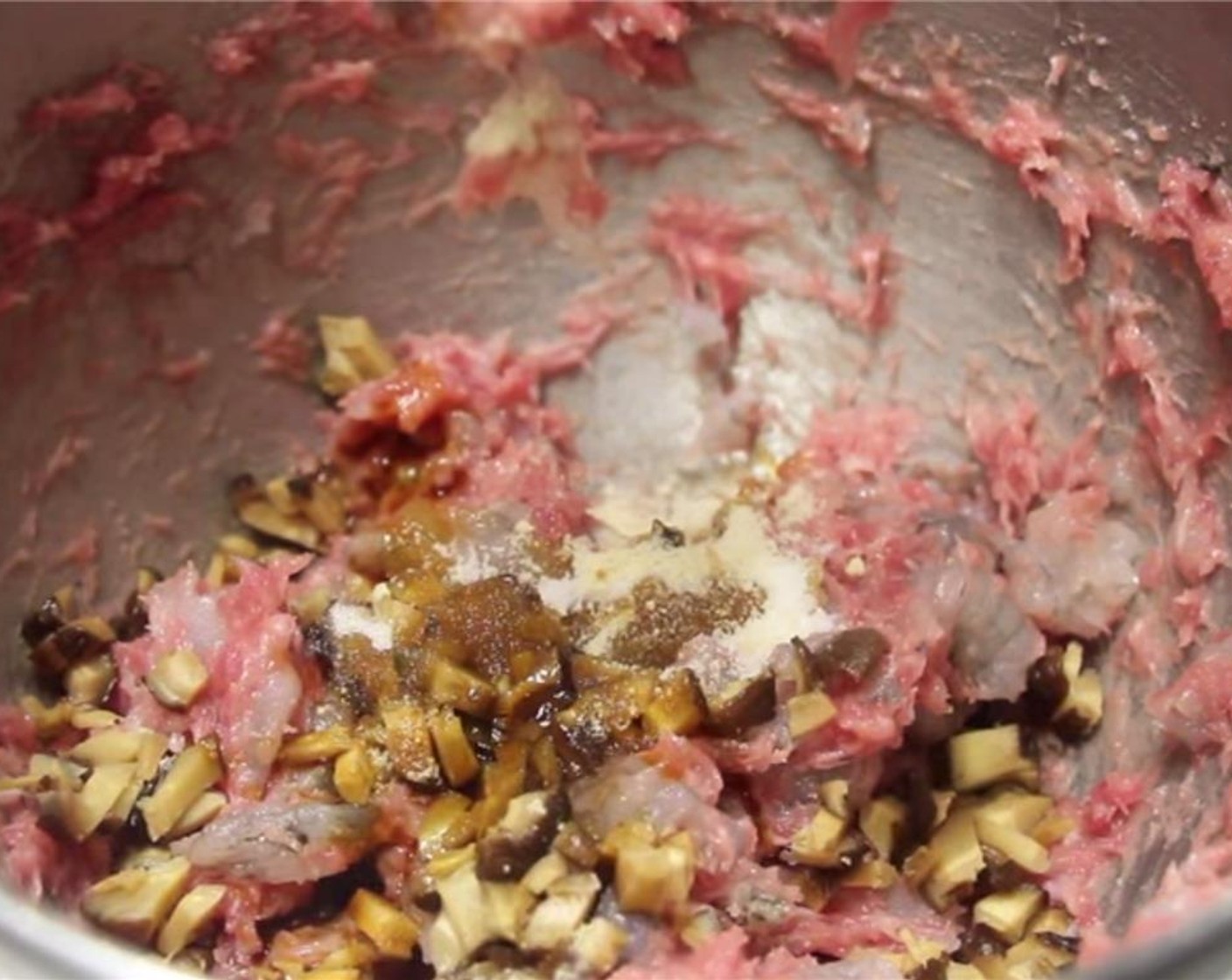 Shitake, Zucker (1 EL), Geflügelpulver (1/2 TL) und Sojasauce (1 EL) hinzugeben. Auf niedriger bis mittlerer Stufe mixen, bis die Zutaten gut vermischt sind.