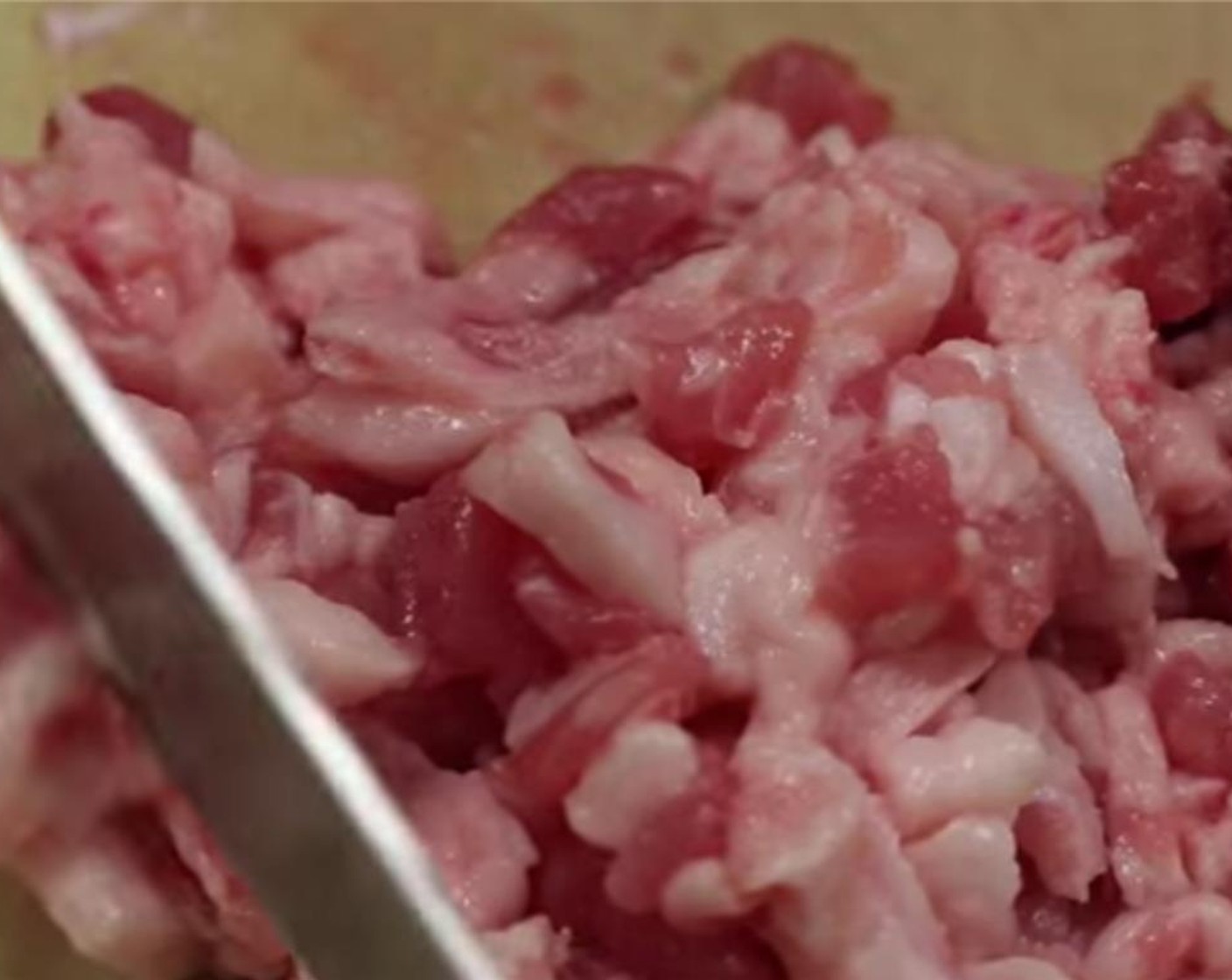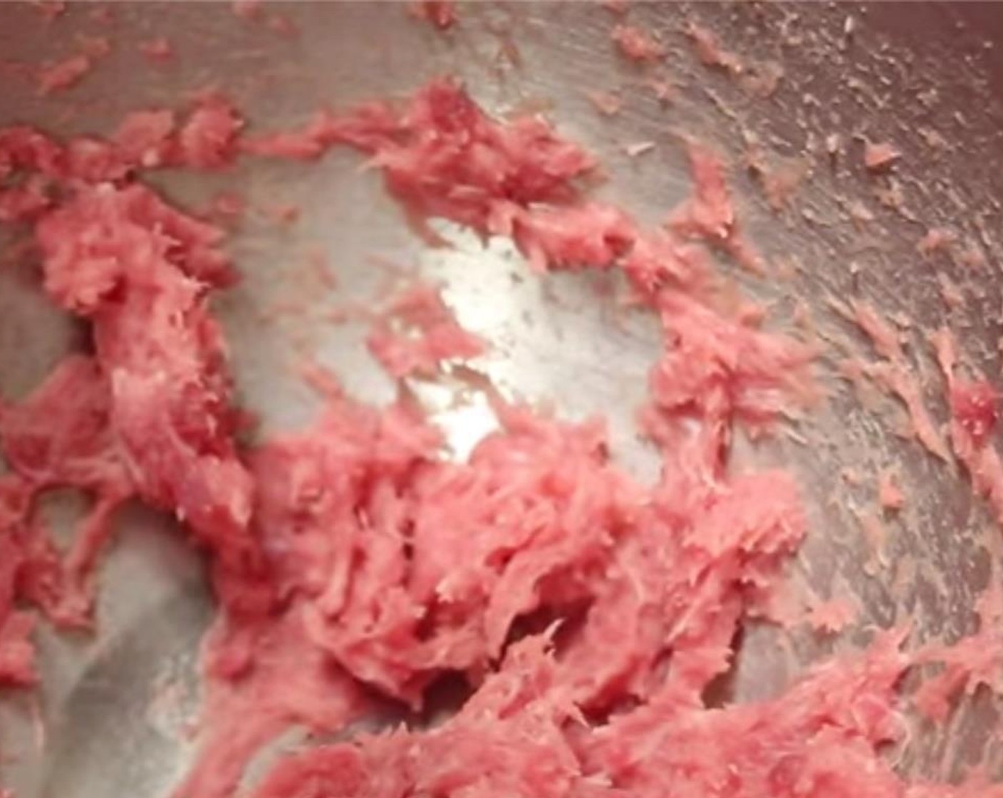 Mixer zunächst auf der niedrigsten Stufe starten. Dann die Geschwindigkeit allmählich auf mittel erhöhen. Das Schweinefleisch rühren lassen, bis es am Rand der Schüssel und des Rührers kleben bleibt.