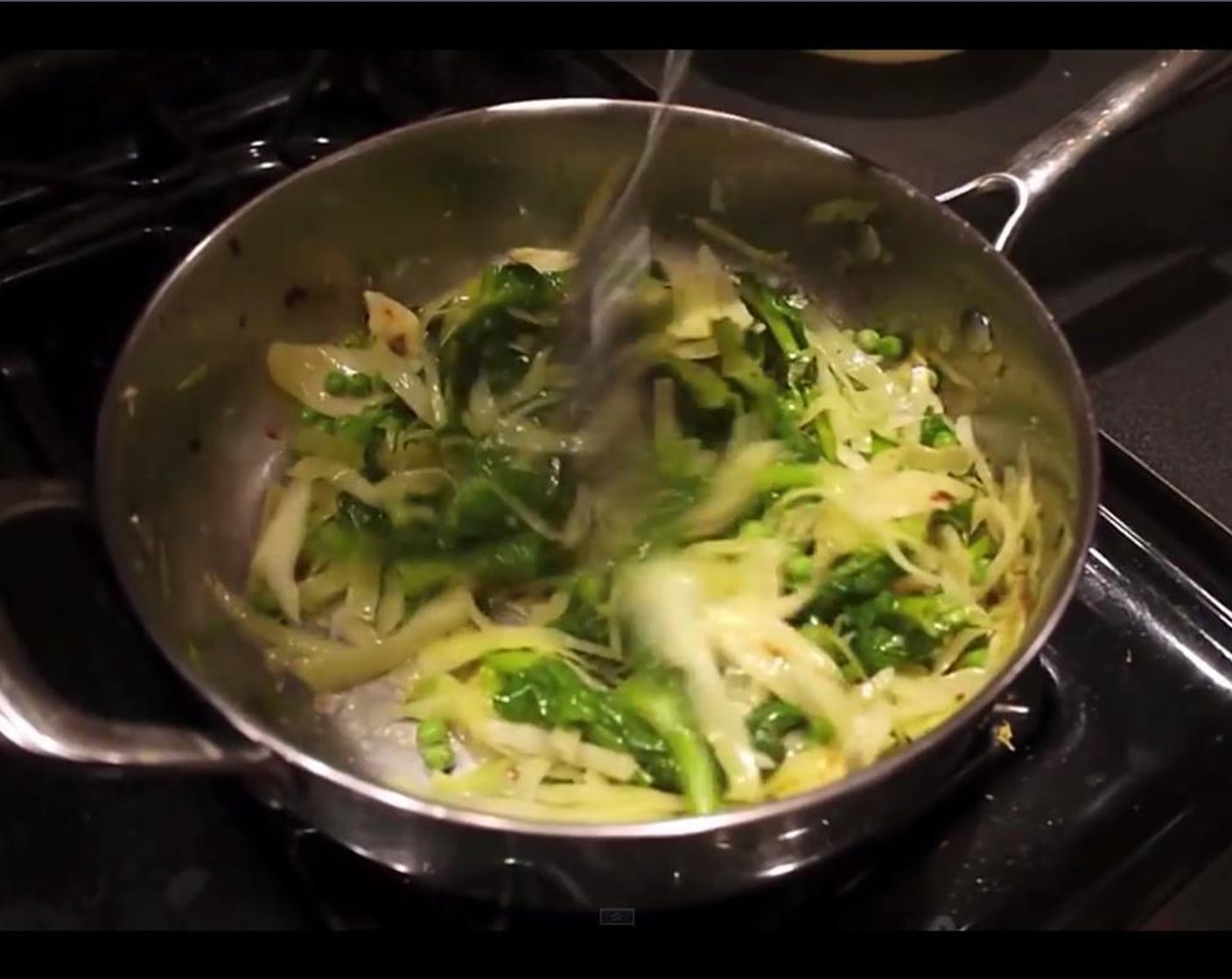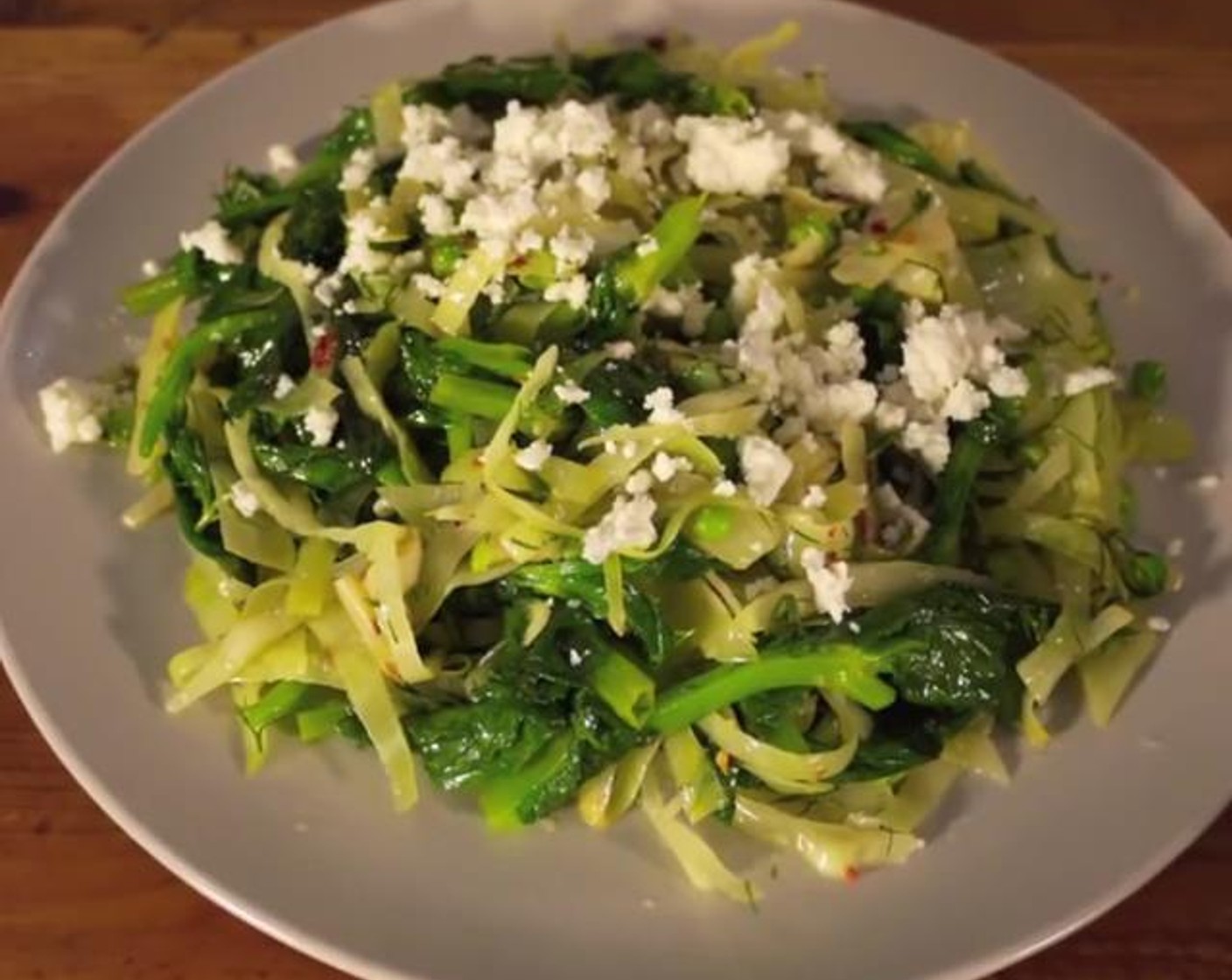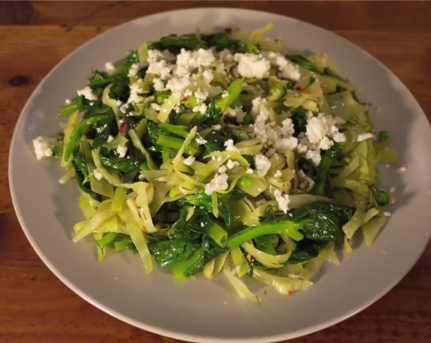 Eine kreative und stilvolle Art, „Grünes Gemüse“ und Erbsen zu servieren, aufgepeppt mit Feta.