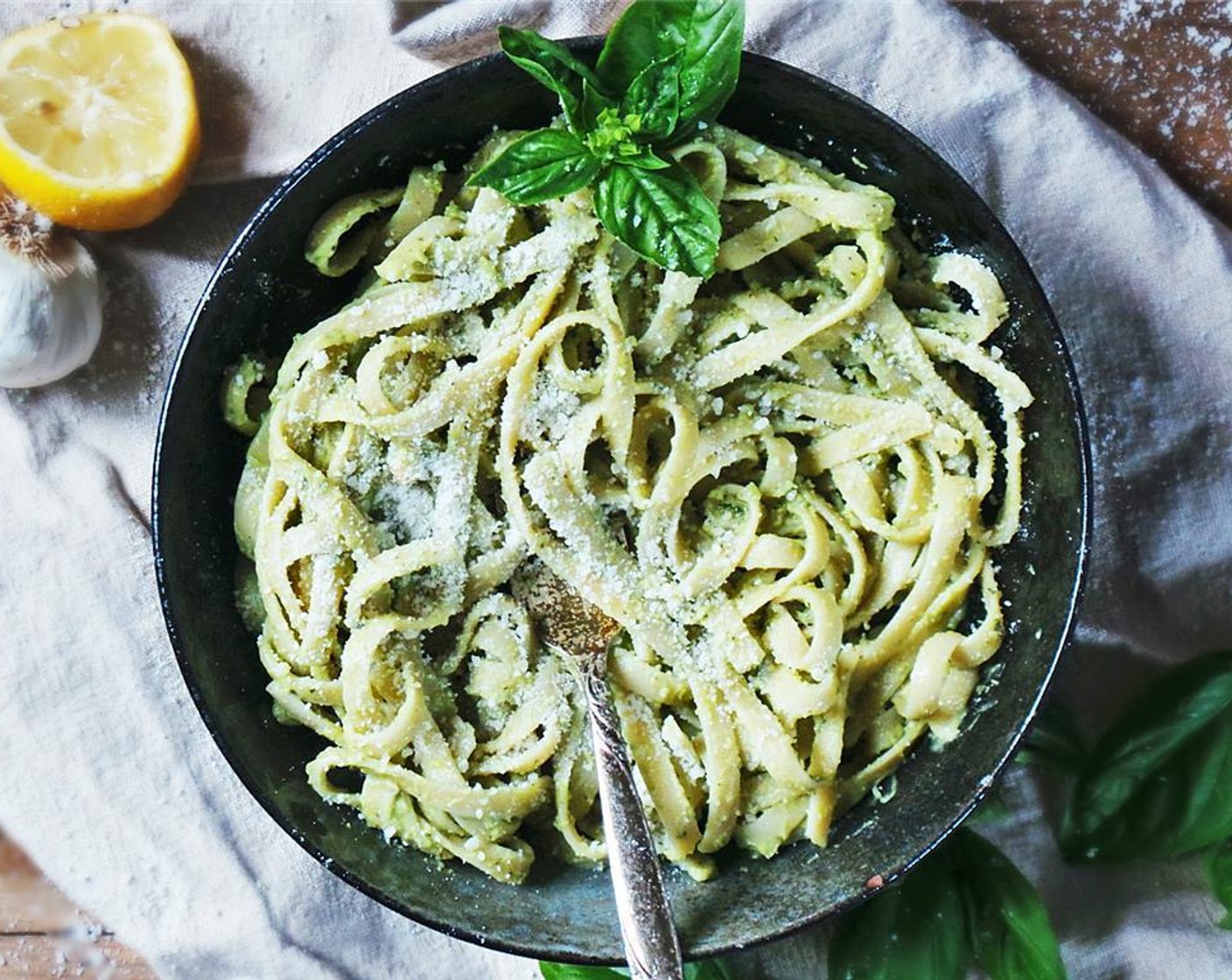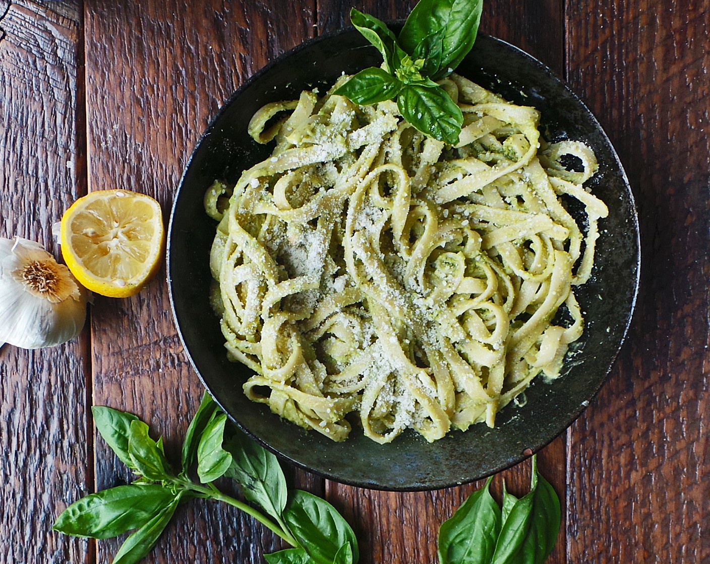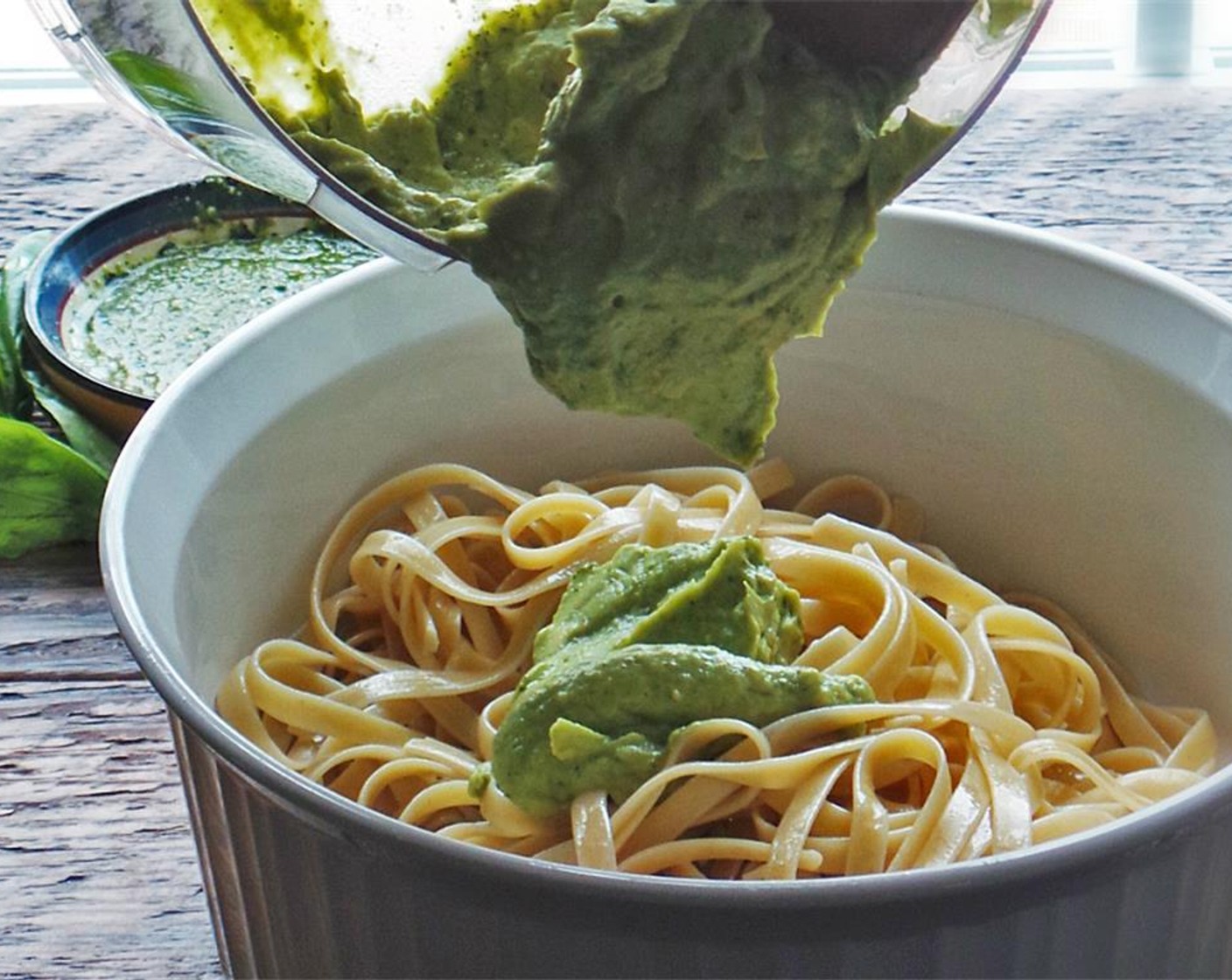 Das ist NICHTS anderes, als Nudeln zu kochen und sie mit einer Sauce zu übergiessen, die direkt aus der Küchenmaschine kommt. Das bedeutet, man kann ohne jede Anstrengung eine hausgemachte Mahlzeit zu sich nehmen. Die wichtigsten Zutaten für die Sauce sind Avocado und Basilikum. Die Avocados verleihen der Sauce eine reichhaltige und cremige Konsistenz, nach der wir uns alle sehnen, wobei das Pesto, der Hauptgeschmacksträger ist.