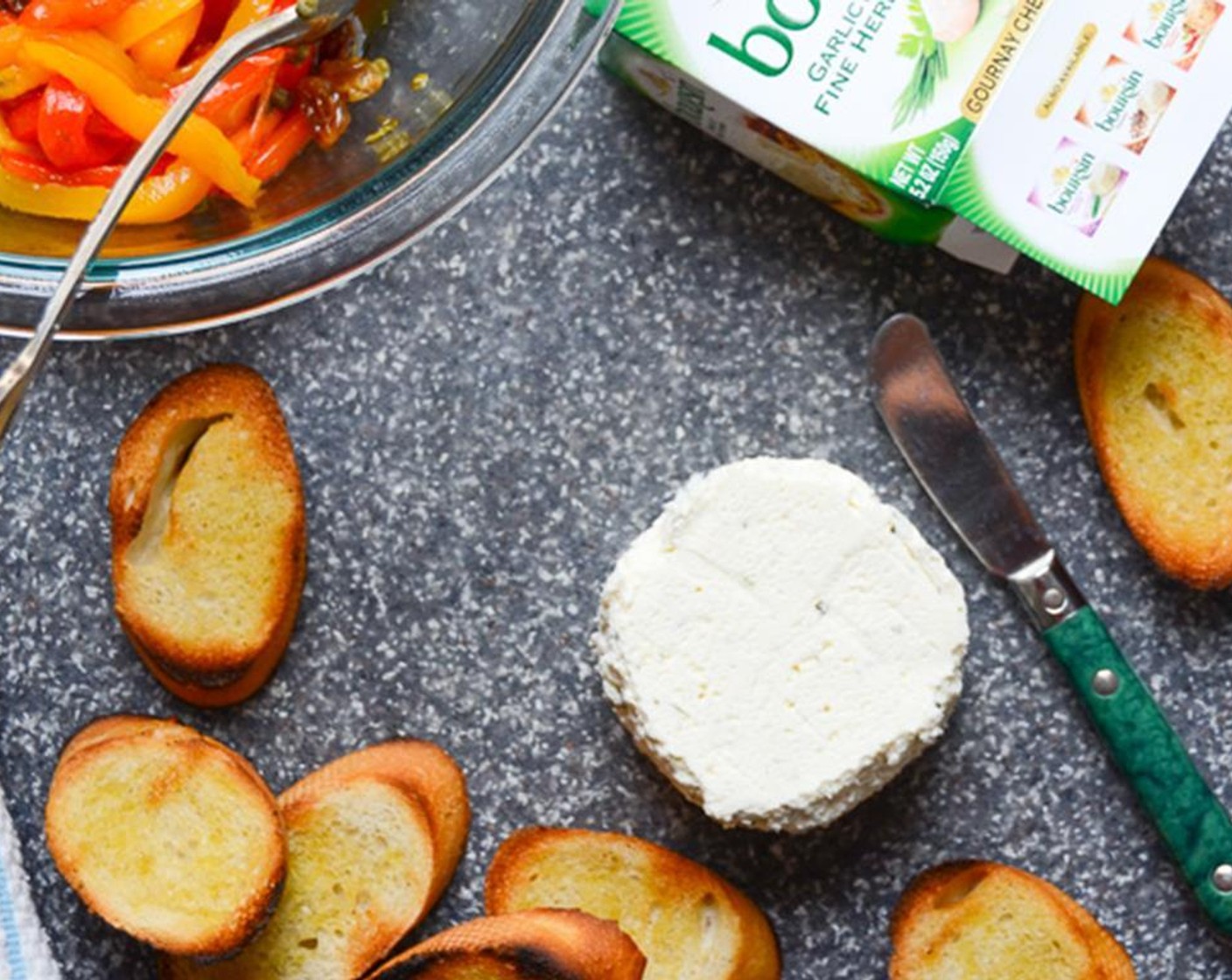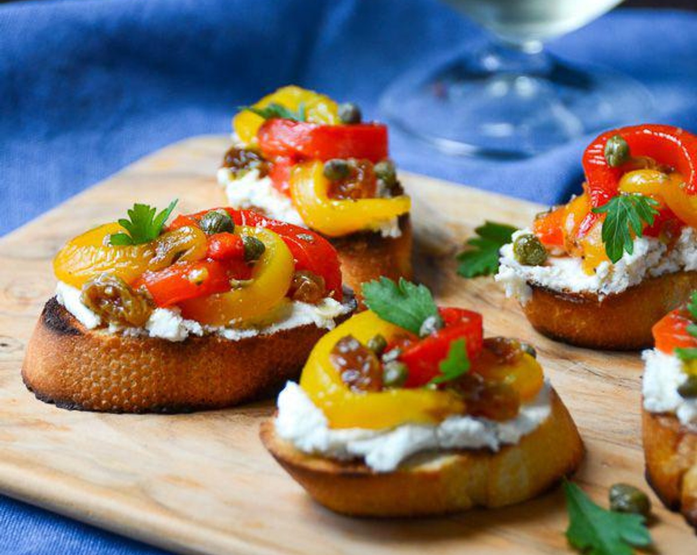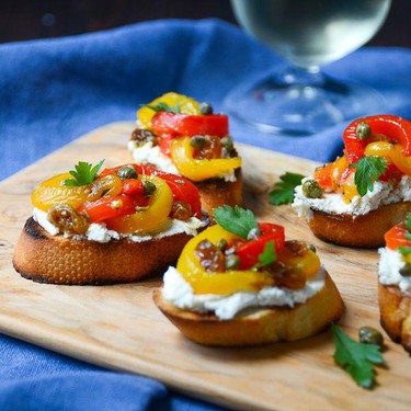 Dieses einfache Bruschetta-Rezept mit einer Schicht weichem Frischkäse ist eine köstliche Vorspeise, die man zu Cocktails geniessen kann. Die Paprikaschoten im Voraus rösten und die Peperonata-Bruschetta kurz vor dem Servieren zusammenstellen.