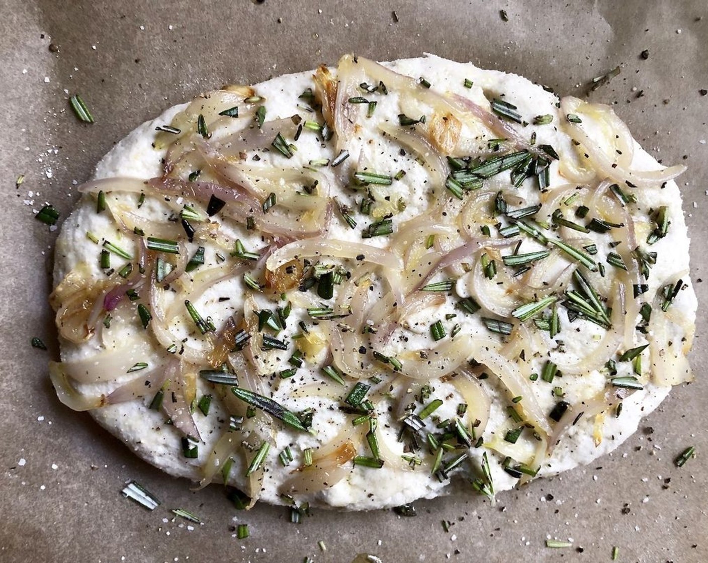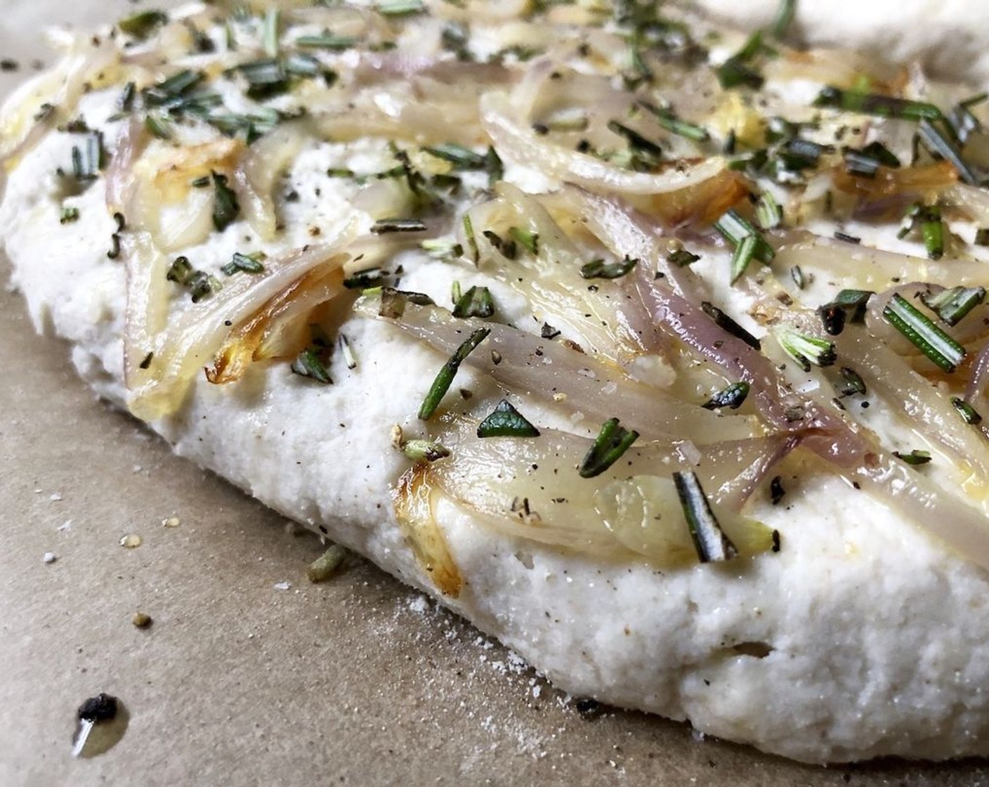 Die sautierten Schalotten über die Teigoberfläche streuen. Darauf achten, dass etwas Teigoberfläche sichtbar ist und nicht zu viele Schalotten auf dem Teig sind, sonst wird die Focaccia nicht braun.