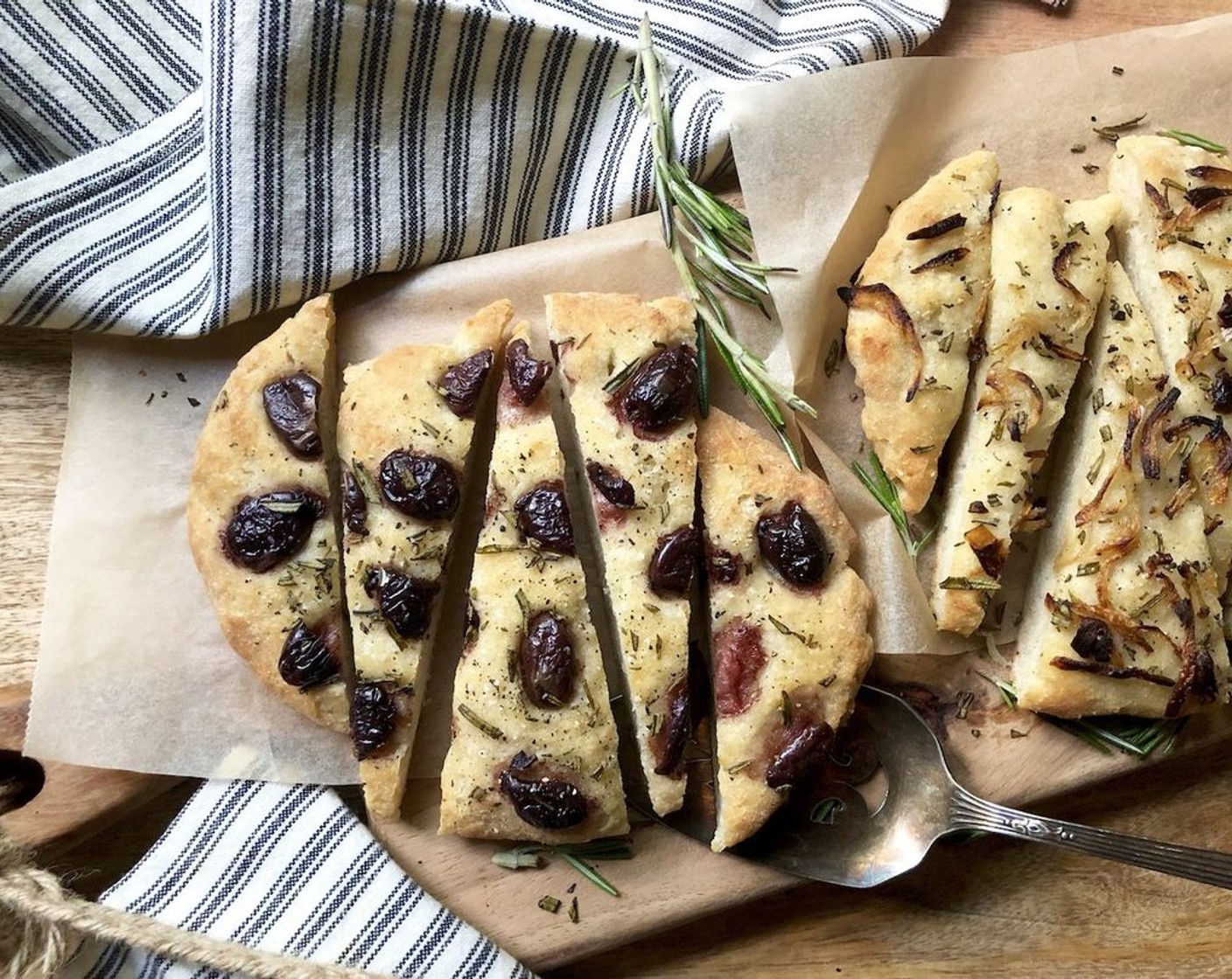 Nach 20 Minuten nach schauen, dass die Schalotten oder die Ränder der Focaccia nicht zu stark gebräunt werden. Wenn dies der Fall ist, das Brot oder die Brote für die verbleibende Zeit im Ofen locker mit Folie abdecken. Die Backzeit variiert je nach Dicke der Focaccia. Aufgrund des Olivenöls bildet diese Focaccia keine knusprige Kruste.