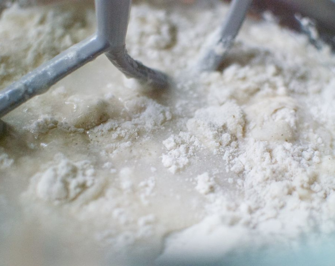 Für die Mehlmischung, Reismehl (850 g), Sorghum Mehl (395 g), Tapioka Mehl (220 g), Kartoffelstärke (240 g) und Xanthan (4 Esslöffel) in einem 5- bis 6-Liter-Behälter mit Deckel gut vermischen.