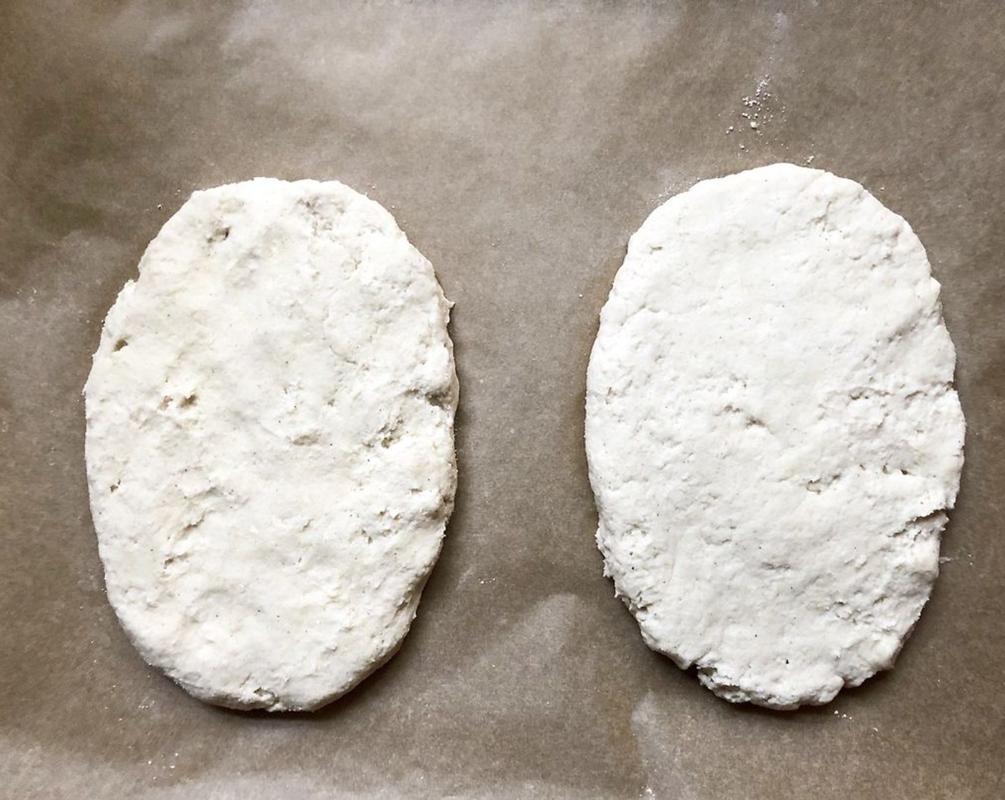 Den Teig und das Backpapier mit etwas Mehl bestäuben. Etwa 500 g Teig auf das vorbereitete Backpapier geben, schnell eine Kugel formen und durch leichtes Drücken mit den Fingern zu einem glatten Teig ausbreiten, mit einer Dicke von etwa 1,3 cm.