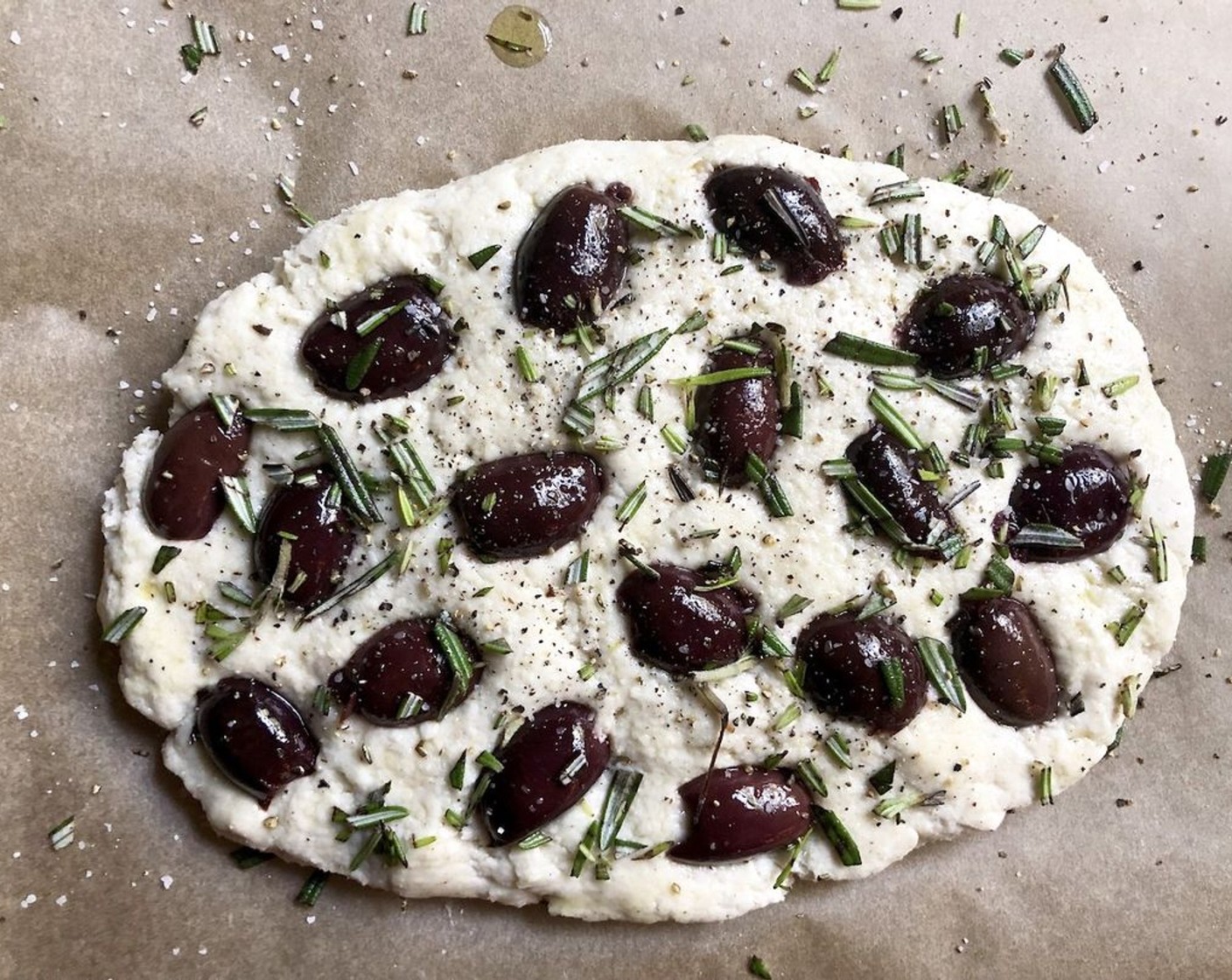 Für die Focaccia mit Oliven und Rosmarin: Oliven (455 g) über die Teigoberfläche verteilen. Auch hier, darauf achten, dass ein Teil der Teigoberfläche sichtbar ist. Mit Rosmarin (1/2 TL) bestreuen. Mit Salz (wenig) und Pfeffer (wenig) würzen und mit einem leichten Spritzer Olivenöl (1 TL) beträufeln. Beiseitestellen und 20 Minuten ruhen lassen.