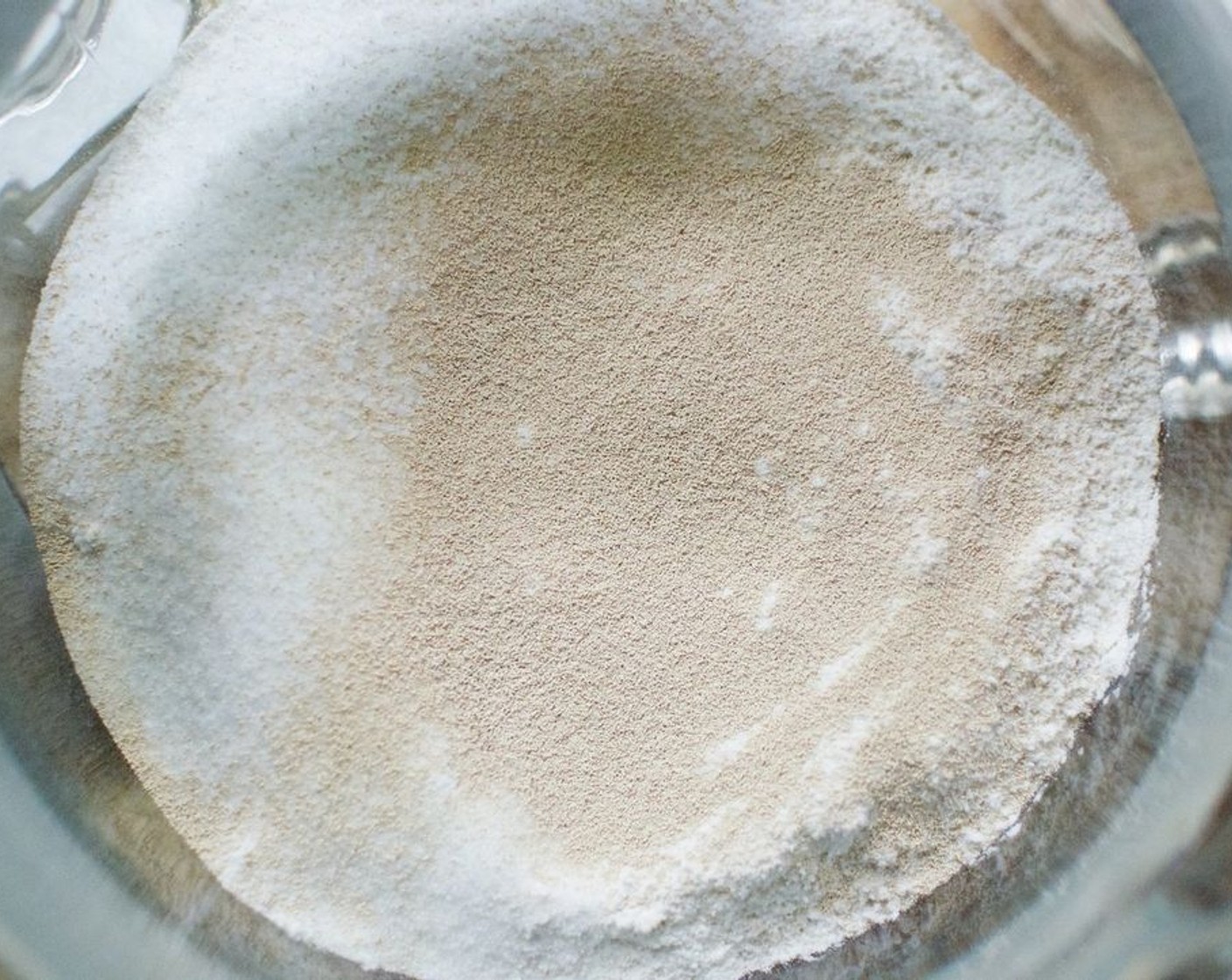 Für den Olivenölteig, in einer grossen Schüssel die Mehlmischung zusammen Hefe (1 EL), Salz (1 1/2 Esslöffel) und Zucker (2 Esslöffel) verrühren.