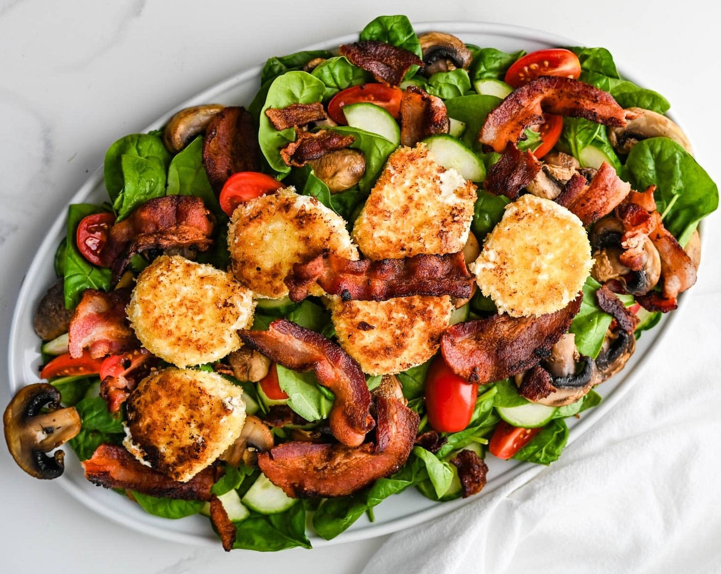 Dies ist kein gewöhnlicher Ziegenkäsesalat. Mit gebratenem Ziegenkäse, knusprig geräuchertem Speck, gekochten Eiern und einem scharfen Speckdressing ist er der Spinatsalat supreme. Spinatsalat mit Ziegenkäsestückchen war schon immer gut, aber dieser Ziegenkäsesalat ist einfach unverschämt lecker.