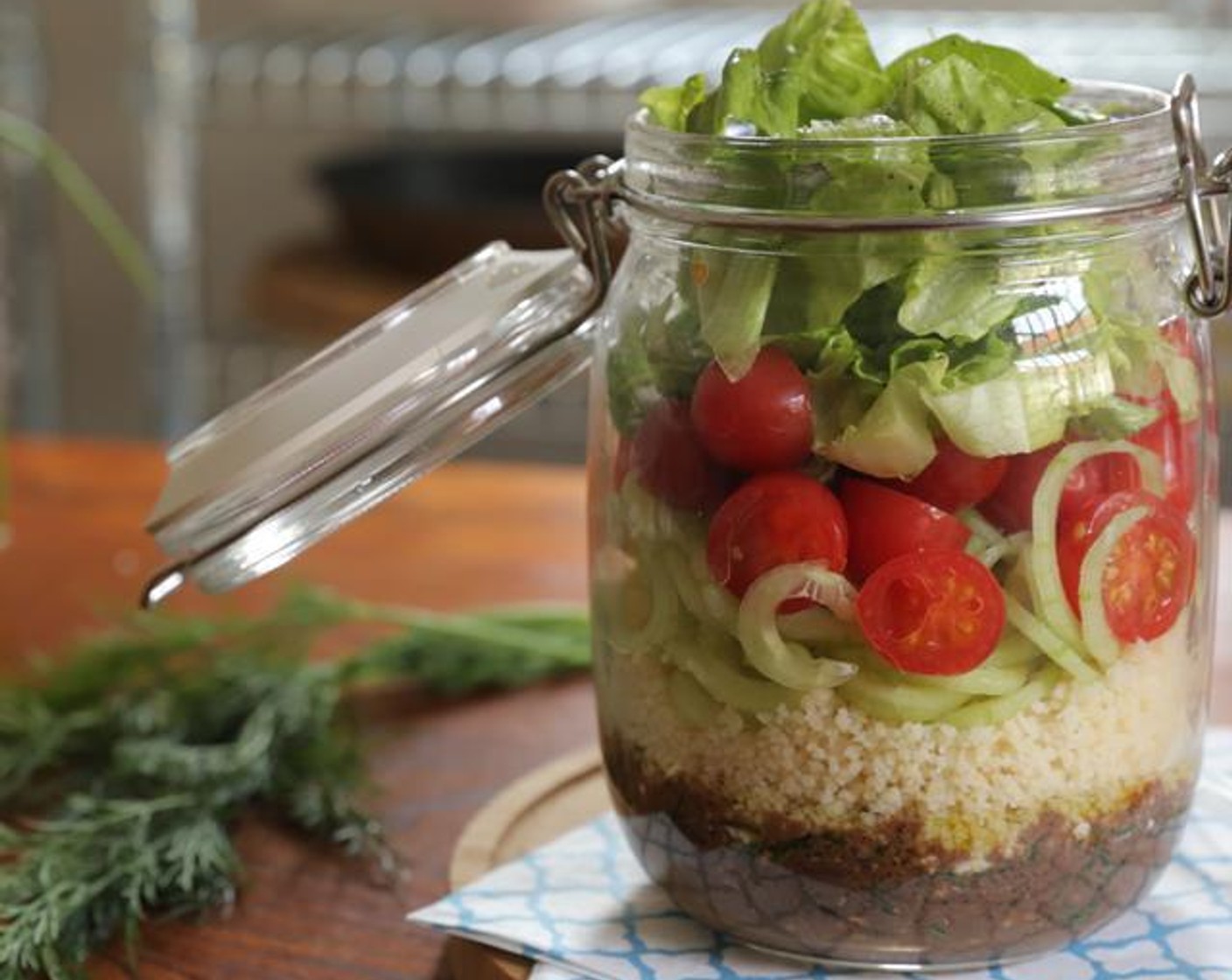 Hier kommt ein griechischer Salat auch für unterwegs. Praktisch im Glas lässt er sich überall bequem mitnehmen.
