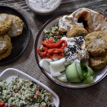 Couscous (wenig), Peperoni (wenig), Gurkenstreifen, Zwiebel (1), Labneh (wenig) in einer Bowl anrichten. Fladenbrot (wenig) und Falafel ebenfalls in der Bowl anrichten. Mit einem Klecks Hummus (wenig) garnieren.