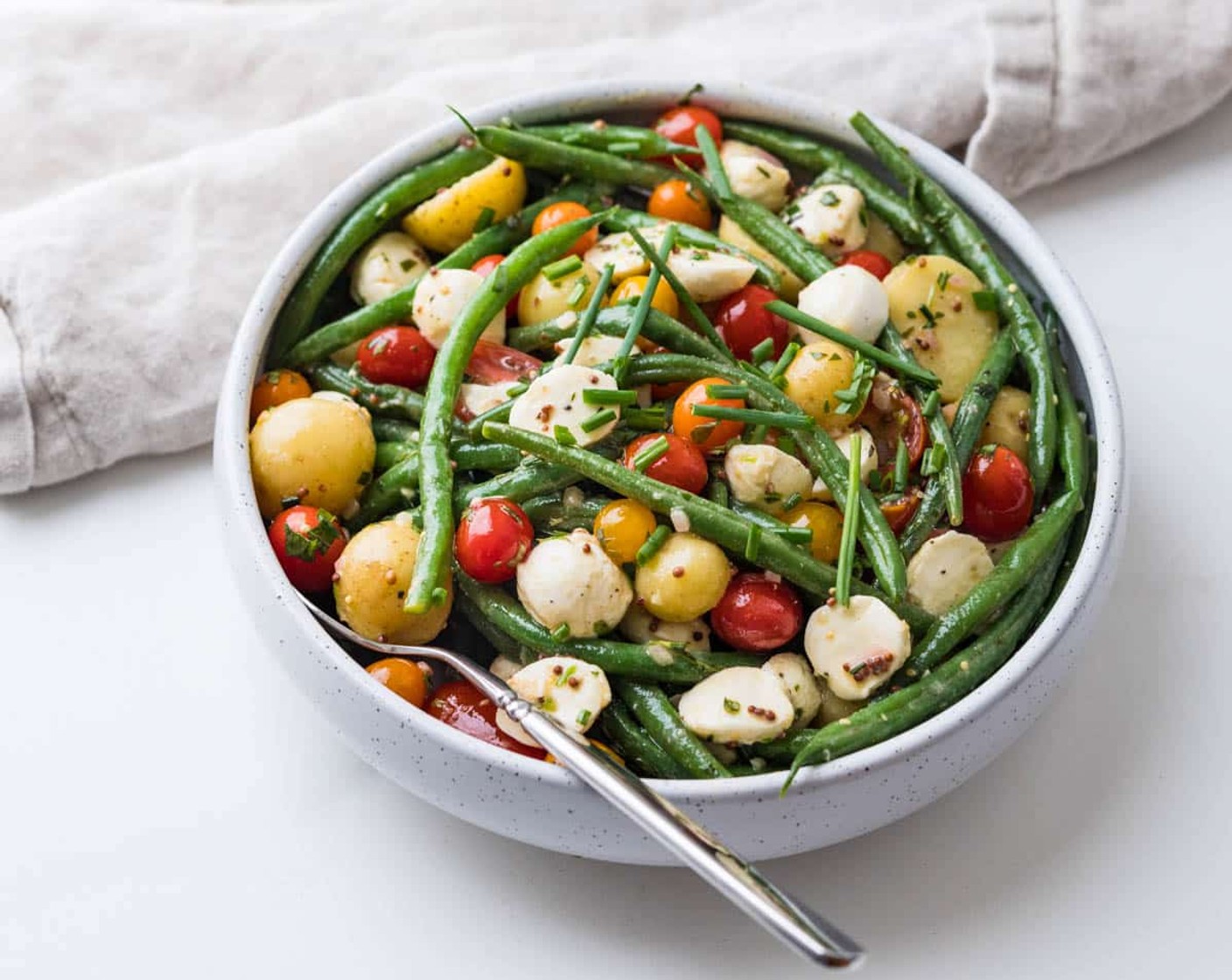 Hier kommt das perfekte Rezept für ein einfaches Sommeressen. Dieser grüne Bohnen-, Kartoffel- und Tomatensalat mit frischem Mozzarella und leichter Zitronen-Kräuter-Vinaigrette mit einem kräftigen Hauch von Senf und frischen Schalotten, ist ein nahrhaftes Gericht, das schnell zubereitet werden kann und das alle lieben.