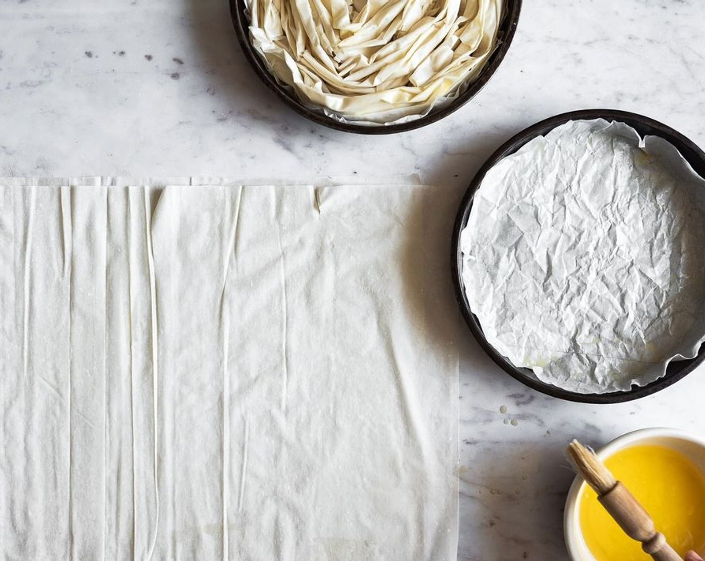 1 Blatt Filoteig (14 Blätter) auf eine saubere Oberfläche legen und mit Butter, ungesalzen (170 g) bestreichen. Weiteres Filoteigblatt über das erste legen und mit Butter bestreichen. Den Filoteig mit den Fingern der Länge nach zu einem lockeren, gerüschten Streifen zusammen knüllen (es ist in Ordnung, wenn der Filoteig etwas reisst).