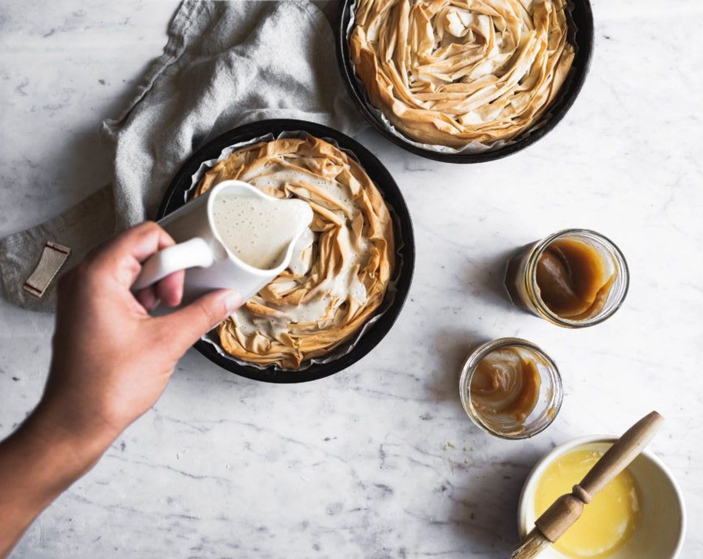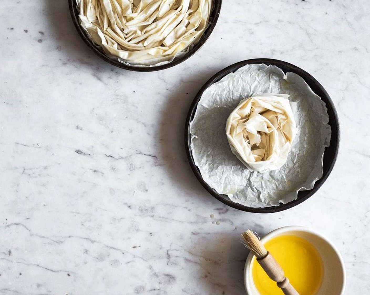 Die Oberseite des gerüschten Filoteigs grosszügig mit der übrigen Butter bestreichen. Im vorgeheizten Ofen 20–25 Minuten backen, bis der Filoteig goldbraun ist.