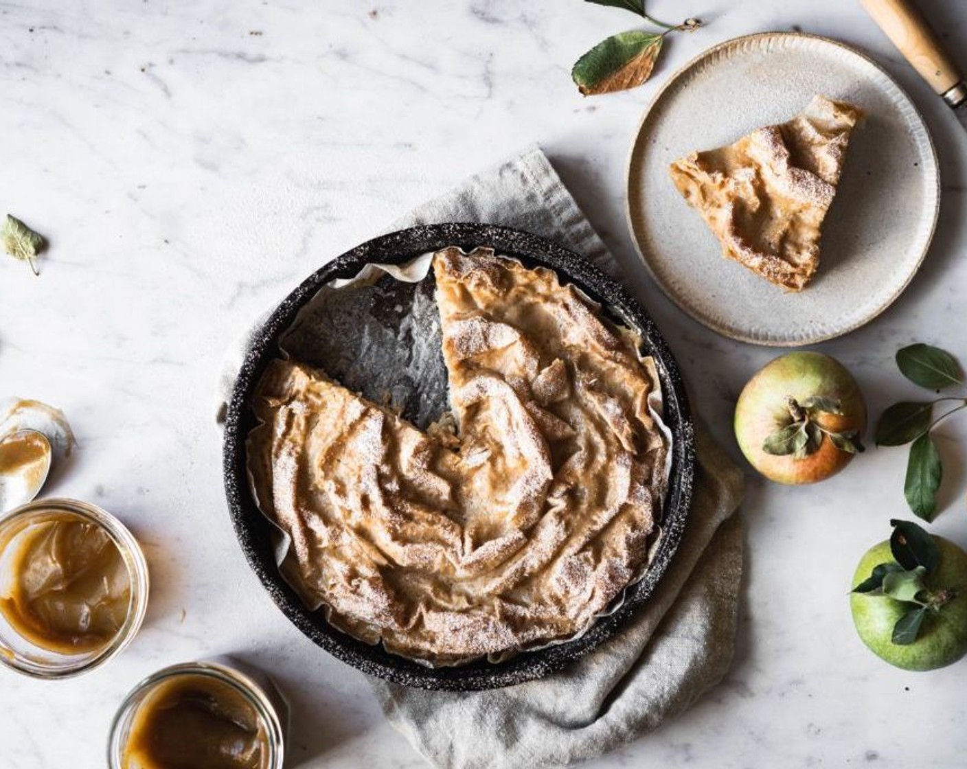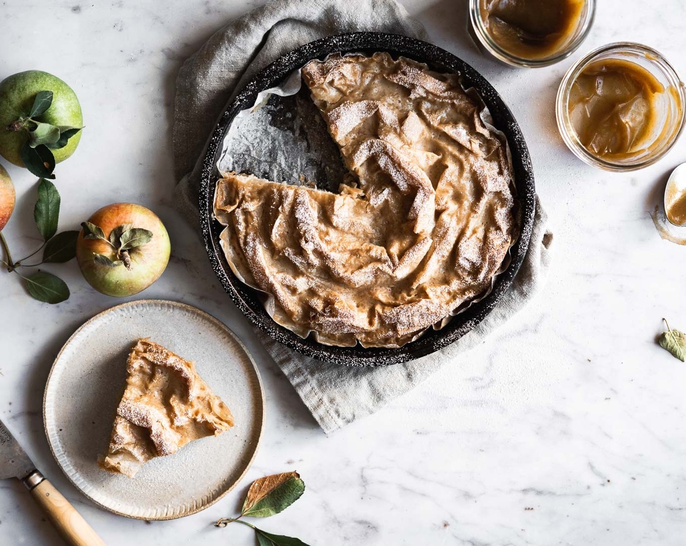 Den Milchkuchen aus dem Ofen nehmen und den Apfelmuss-Custard darüber verteilen. Danach den Kuchen wieder in den Ofen geben und weitere 20–25 Minuten backen oder bis der Custard in der Mitte fest ist.
